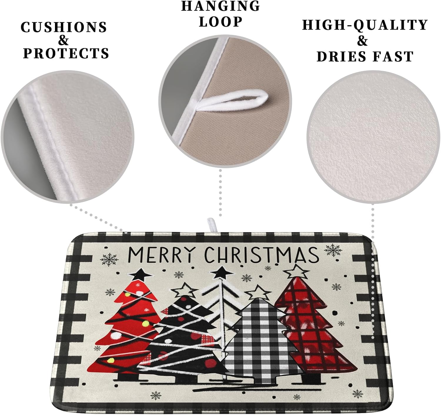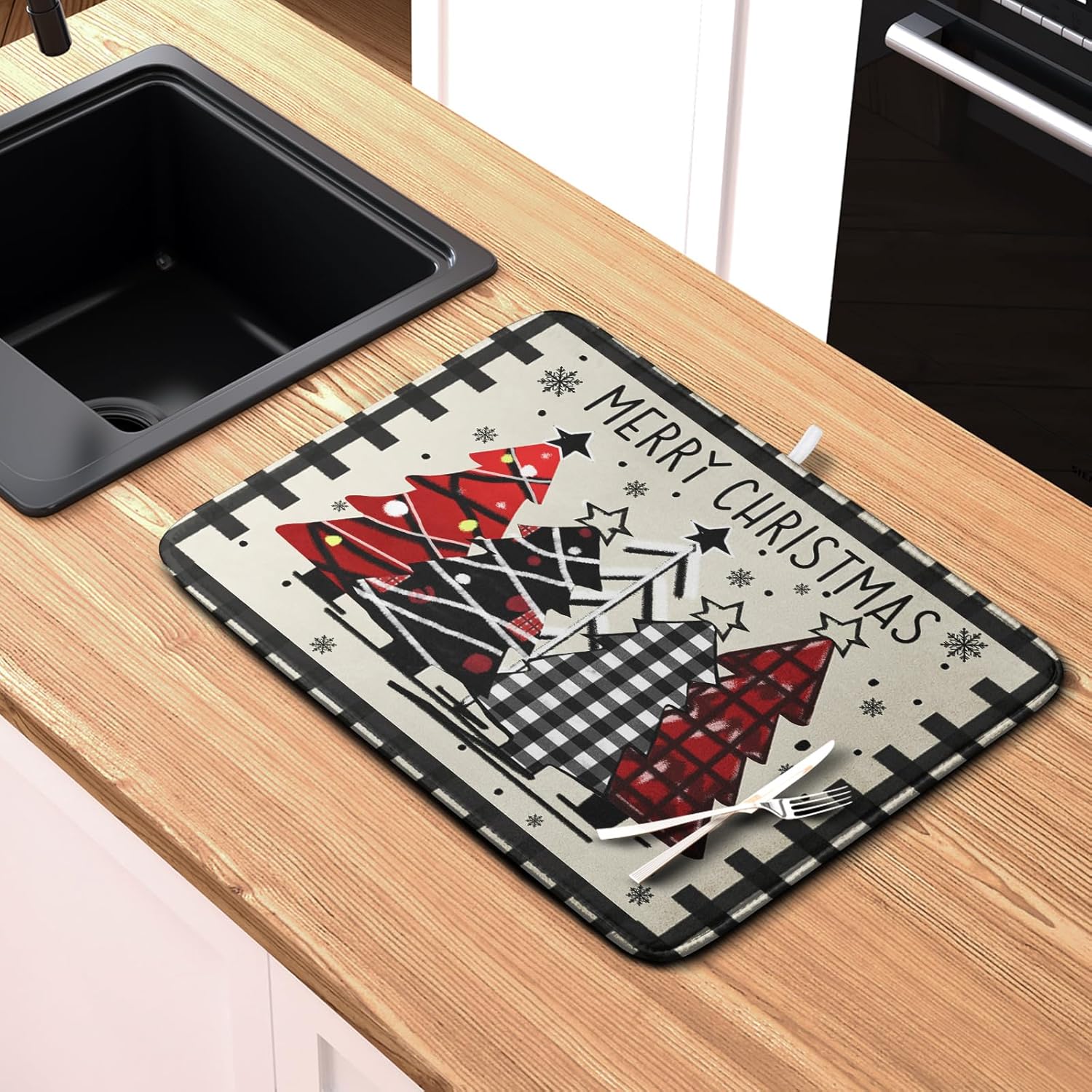 Christmas Trees Kitchen Dish Drying Mat 18x24 Inch Merry Christmas Black White Buffalo Plaid Dish Drainer Mat Absorbent Reversible Microfibe Drying Dish Pad for Winter Kitchen Counter Decor
