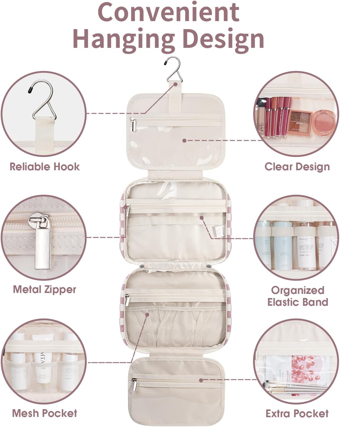 Narwey Hanging Toiletry Bag for Women Travel Makeup Bag Organizer Toiletries Bag for Travel Size Essentials Accessories Cosmetics (Dusty Pink Checkerboard (Medium))