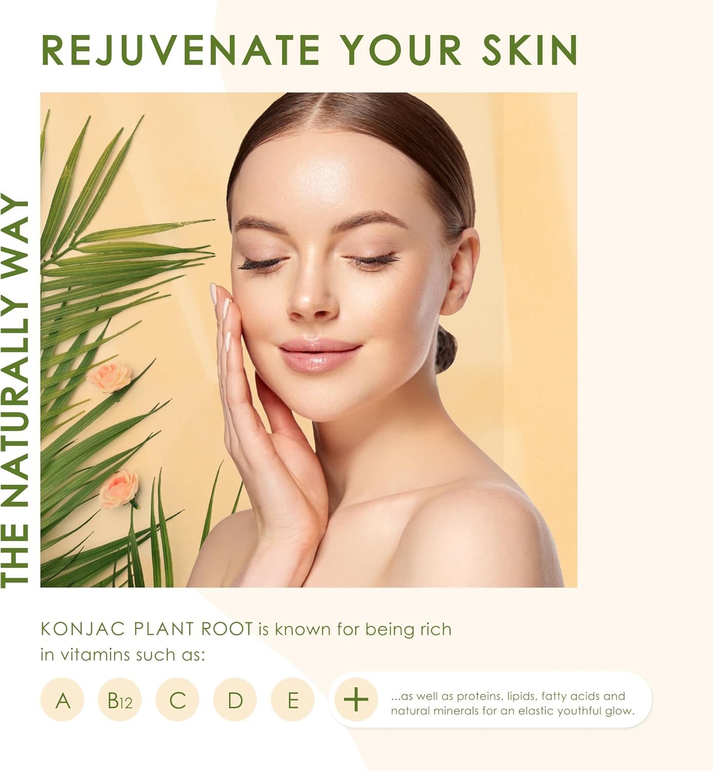 - REPLENISH Your Skin: Konjac plant is both luxurious and effective. This all-natural root is known for being rich in vitamins such as A, B12, C, D, & E, proteins, lipids, fatty acids and natural minerals such as copper, zinc, iron and magnesium. It also helps balance the skinâs natural pH level.