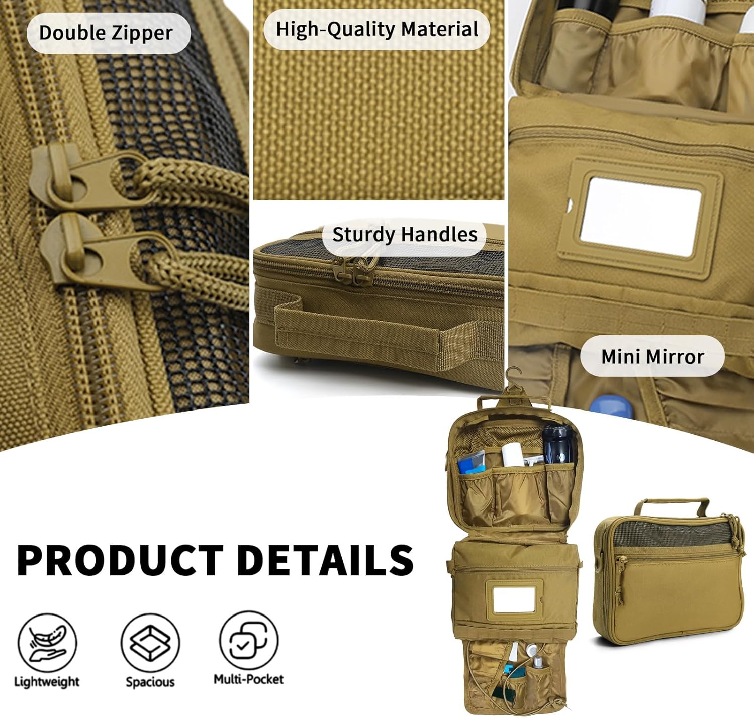 - Multi-Functional Hanging Toiletry Bag for Men - Built-In 360° Rotating Hook for Bathroom/Campsite Use + Front MOLLE Panel Compatible with Carabiners & Accessories, Back Zipper Pocket Secures Valuables.