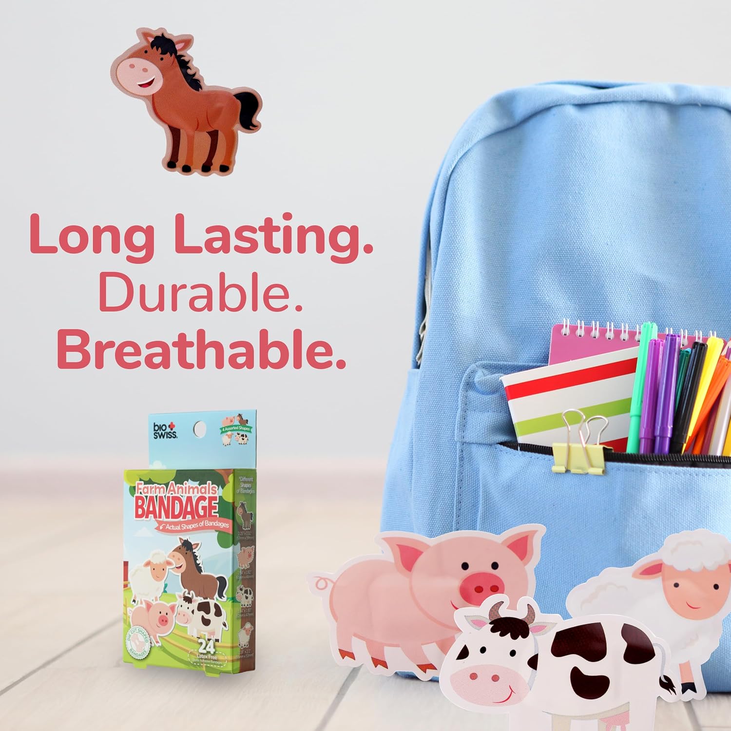 BioSwiss Kids Bandages, Farm Animal Shaped Self Adhesive Bandage Set, Latex Free, Sterile Wound Care, 24 Count