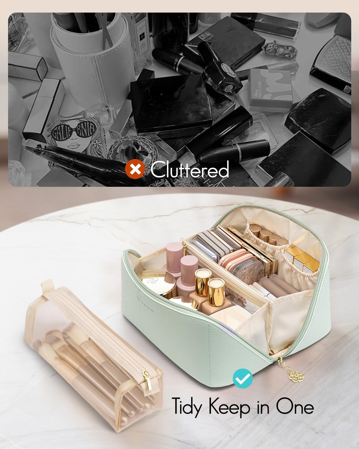 Vlando Makeup Bag,Large Capacity Toiletry Bag for Women Waterproof Portable Make up Pouch PU Leather Open Flat Cosmetic Bag(Mint Green)