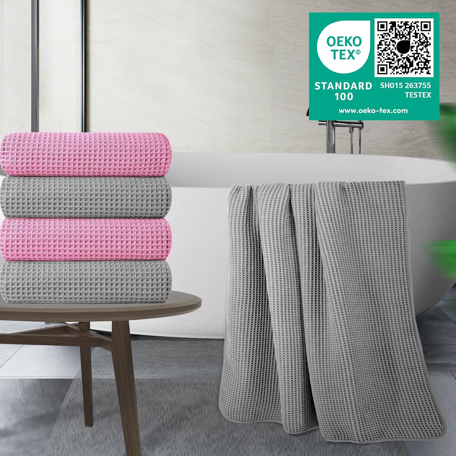 POLYTE Microfiber Oversize Quick Dry Lint Free Bath Towel, 60 x 30 in, 4 Pack (Waffle Weave)