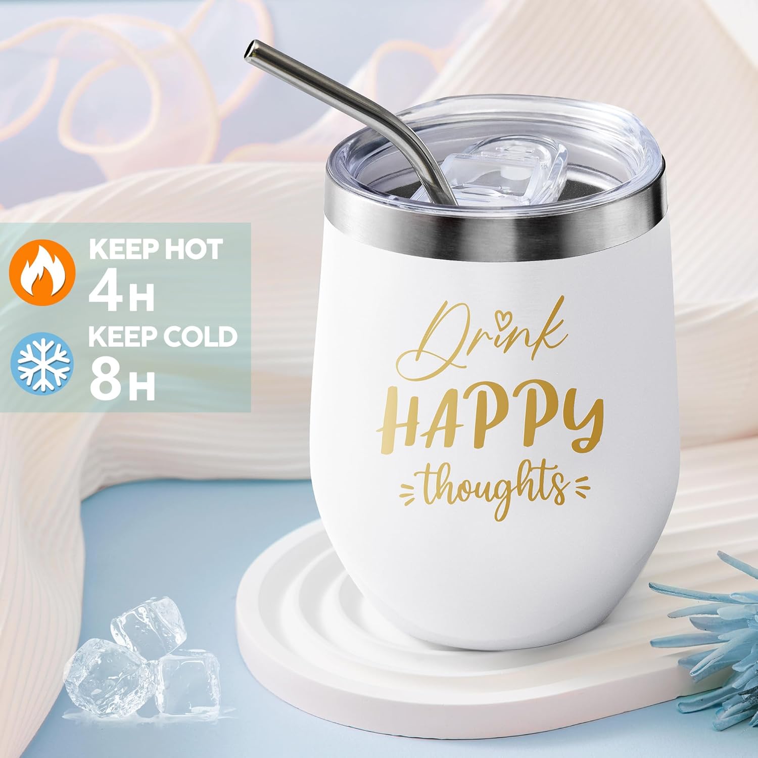 - THOUGHTFUL INSULATED VACUUM TUMBLER GIFT SET: Crafted from 18/8 food-grade stainless steel with double-walled vacuum insulation, this sweat-free 12oz insulated tumbler keeps drinks hot for 6 hours and cold for 9 hours. The motivational quote, "Drink Happy Thoughts," will brighten her day as she enjoys coffee, tea, or wineâmaking it an ideal relaxation gift for best friends, moms, sisters, daughters, grandmas, wives, girlfriends, coworkers, and teachers