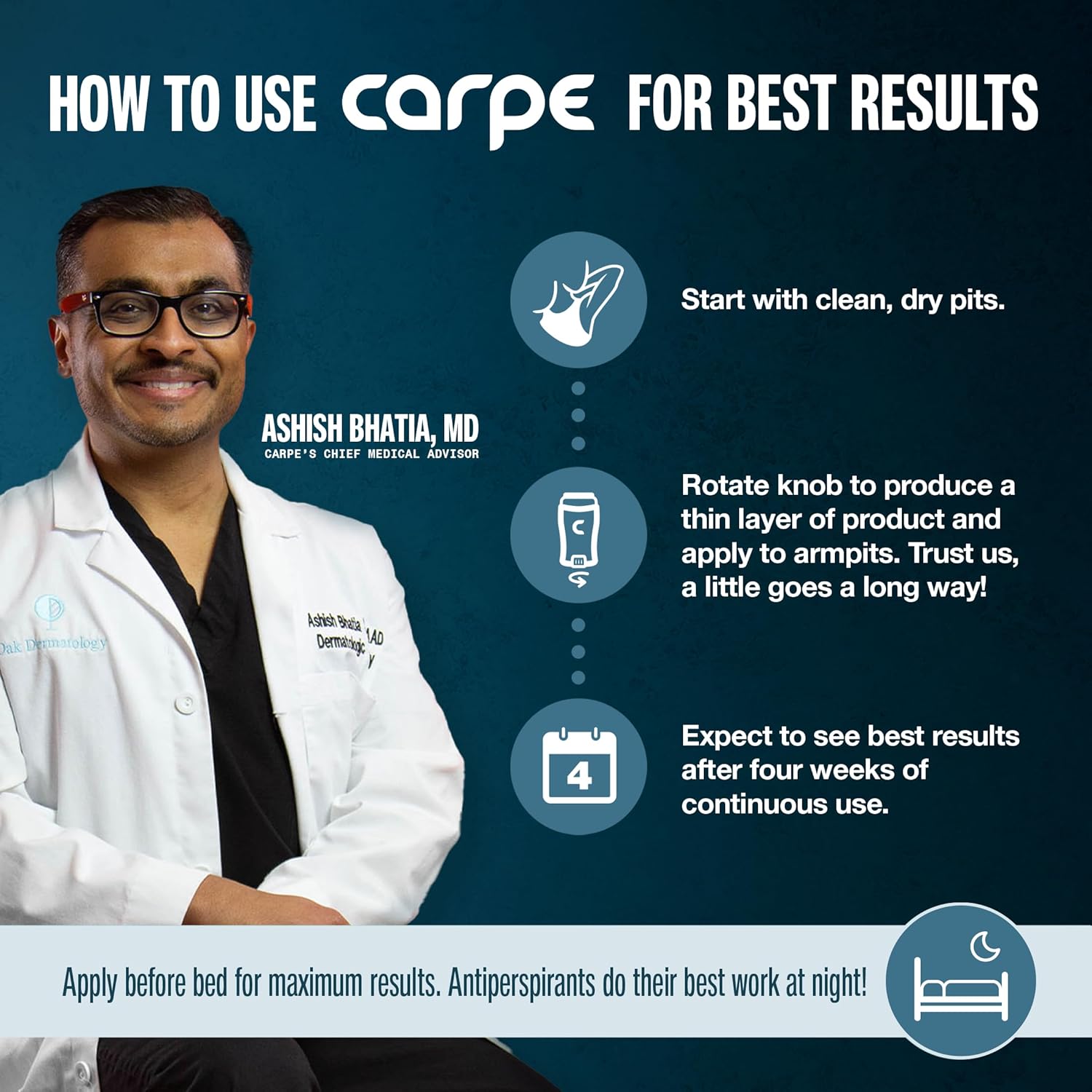 - CARPE UNDERARM LOTION DIRECTIONS- PLEASE READ: Apply every night before bed and again every morning. For maximum efficacy and best results, use consistently for 4 weeks. Consistency is key. Applying before bed is very important to achieving great results because you're sweating less at night, which allows the product to have the most effect.