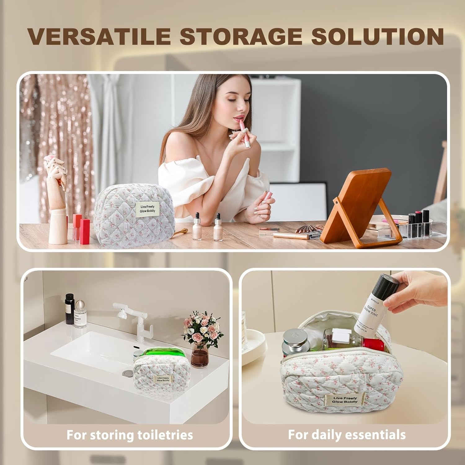 - Set of 3 Pieces: The set includes three cosmetic bags in varying sizes for versatile use.. T9.45×7.10×6.30 inches, 9.45×6.70×3.55 inches, and 7.85×5.50×3.15 inches respectively, our cute quilted makeup bags are perfectly sized for portability.
