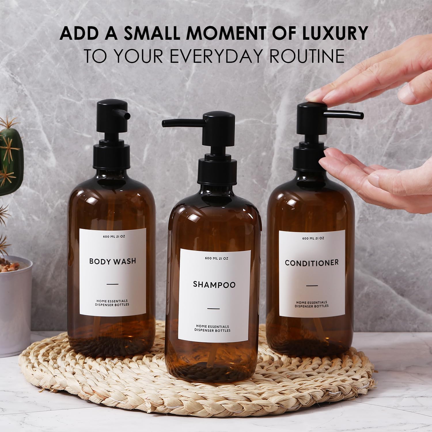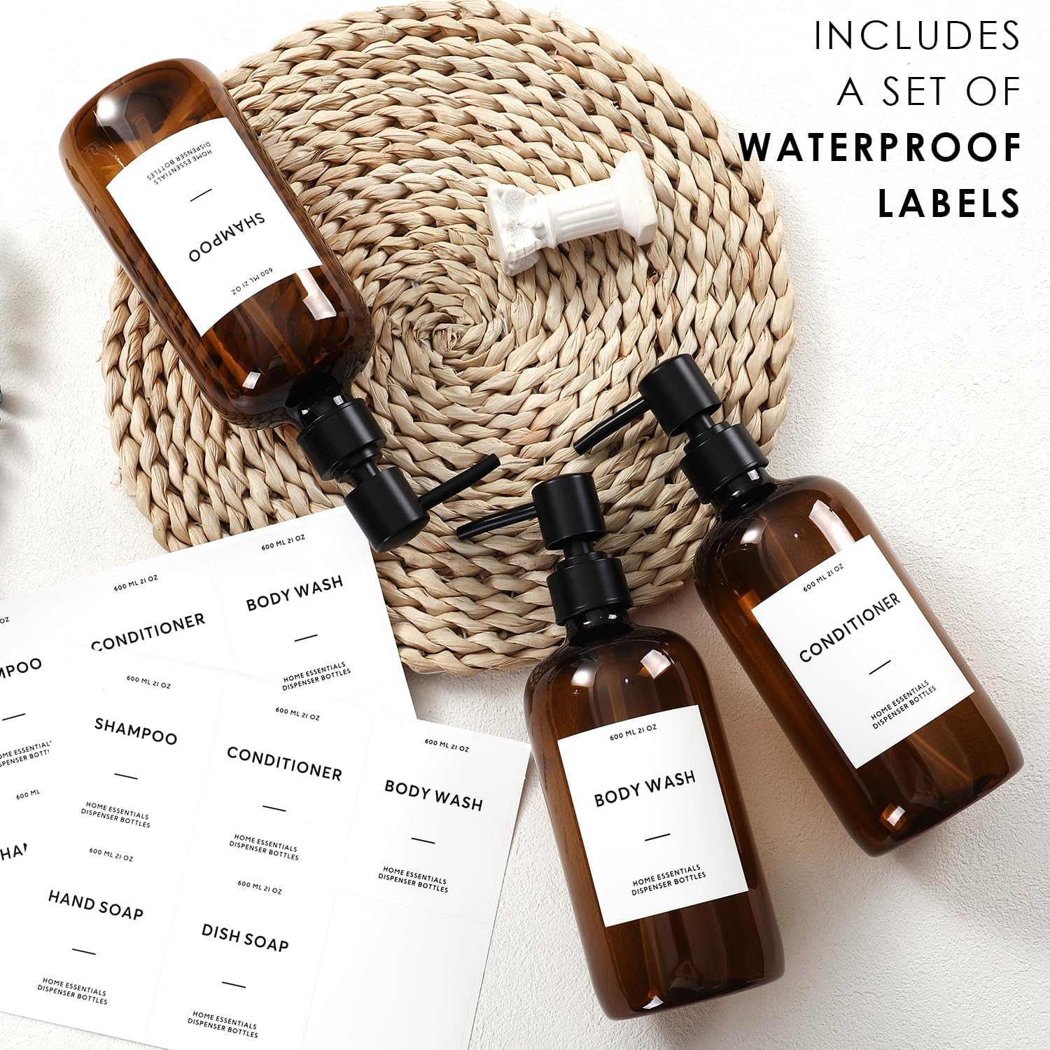 - BATHROOM SHOWER DISPENSER SET OF 3 - The Bathroom dispenser set contains 3-Pack 21oz(600ml) brown bottles, 3 black pumps, 5 waterproof white labels(“SHAMPOO”, “CONDITIONER”, "BODY WASH", "HAND SOAP", "DISH SOAP"), the pump bottles for shampoo and conditioner are instantly help to organize your bathroom, Perfect Bathroom Essentials for home or hospitality.