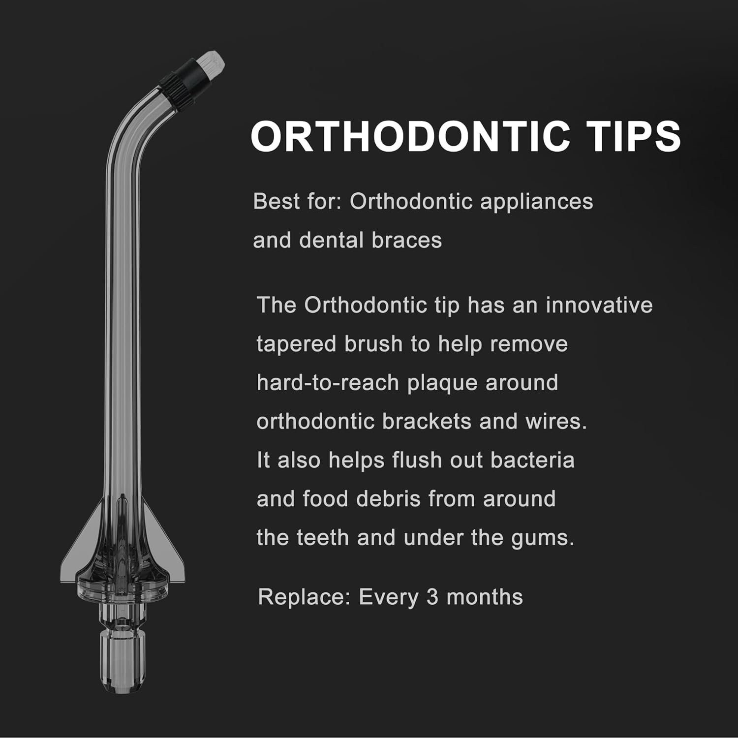 - 【Orthodontic Tips】The Tips are designed to clean around braces . The tapered brush removes hard-to-reach plaque around orthodontic brackets and wires. It also helps flush out plaque and food debris from around the teeth and under the gums.