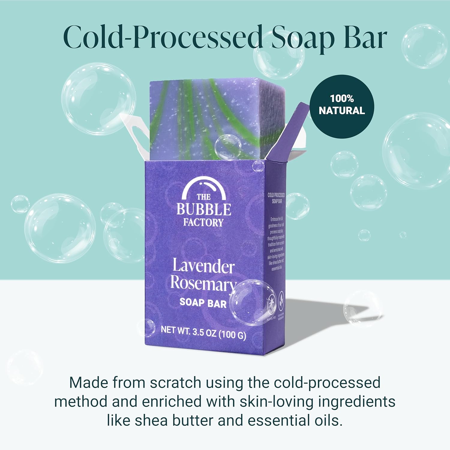 The Bubble Factory Handmade Soap, All Natural Soap for Women & Men, Hand, Bath & Body Natural Bar Soap, Vegan, Palm Oil Free, Made in USA with Shea Butter + Essential Oils, Lavender Rosemary, Single