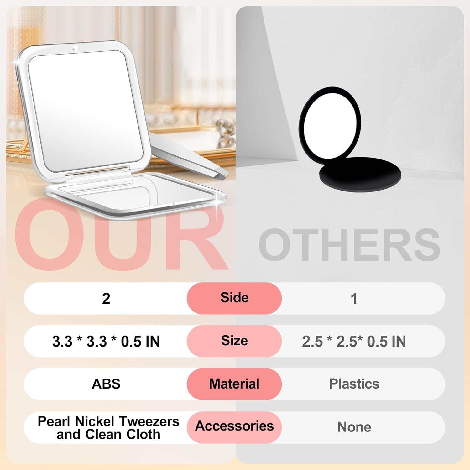 - Compact Mirror: This small mirror is 3.3*3.3*0.5 inches in length, width and height, weighing 3.3 ounces, with double-sided folding design, with 1X and 30X mirrors, which can be rotated 180° to meet your different makeup needs