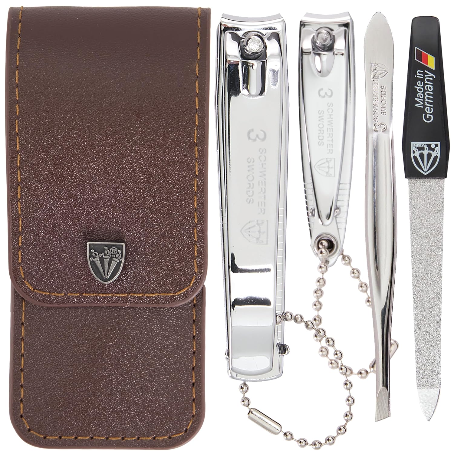 3 Swords Germany - Brand Quality 4 Piece Manicure Pedicure Grooming kit Set for Professional Finger & Toe Nail Care Tweezers File Clipper Brown Synthetic Leather case - Made by 3 Swords