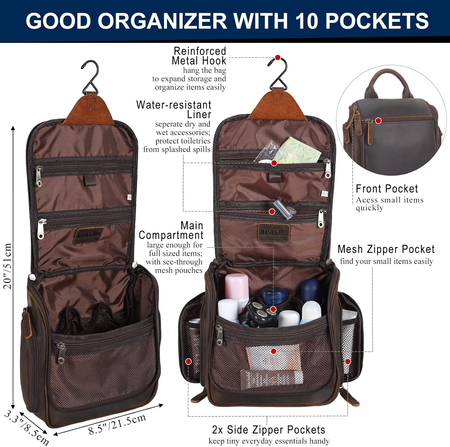 - 【Quality Materials】 Brown toiletry bag for men, crafted of 2mm thick full grain leather, processed with crazy horse leather tech to enhance durability and keep original pores and texture of cowhide, rough rugged look being good match to masculine style; Outfitted with ykk zippers and metal hook to to withstand long-lasting use of traveling; Water-resistant liner, easy to wipe clean, to separate dry and wet items, and to protect the toiletries from common bathroom splashed spills.