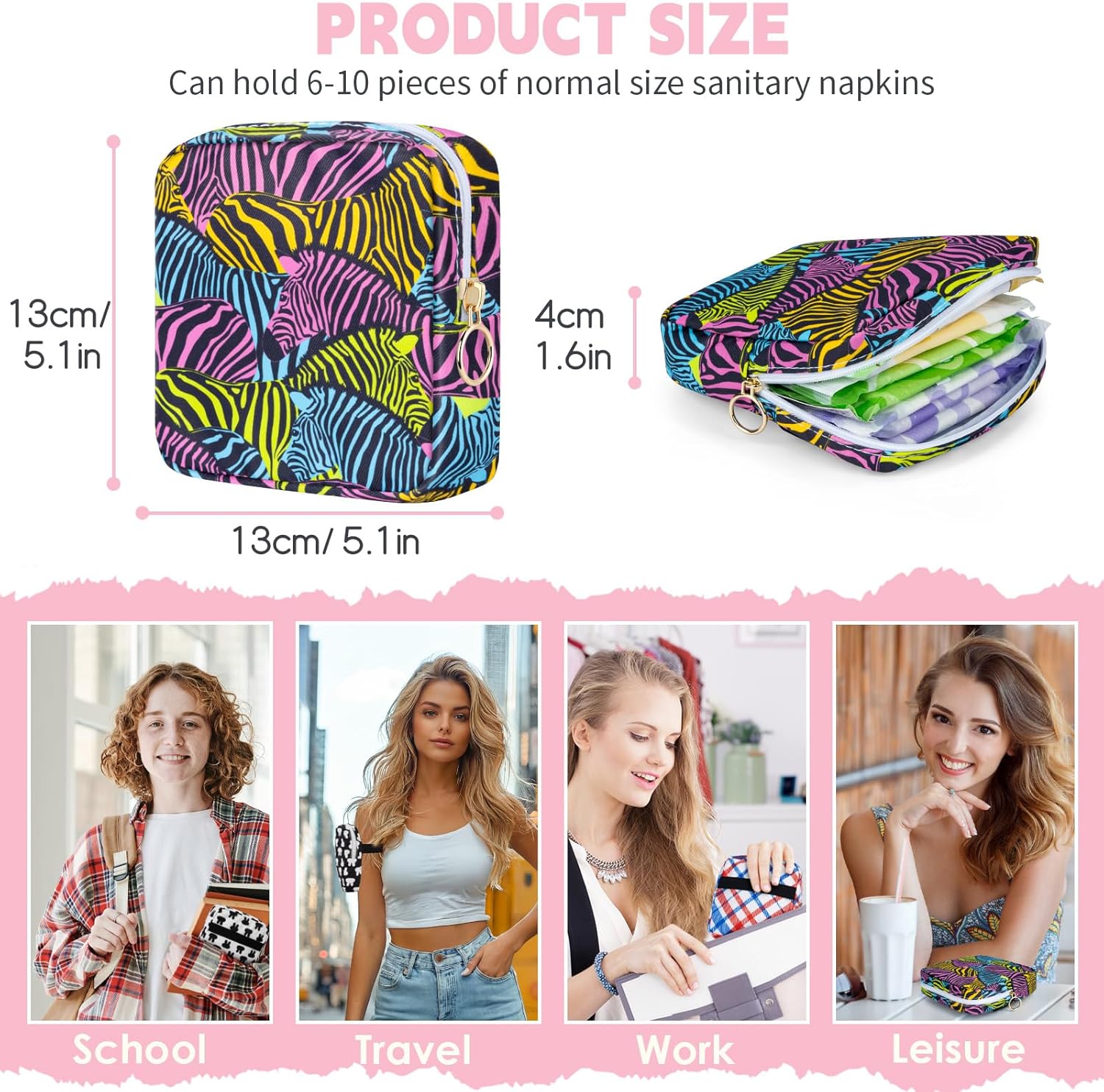 - đ ăPerfect Size for Period Essentialsă - This compact period bag (5.1 x 5.1 x 1.6 in / 13 x 13 x 4 cm) easily holds 6-10 standard pads (Size 1-5) or a combination of pads, liners, and tampons, making it an ideal sanitary napkin storage bag for your purse or backpack