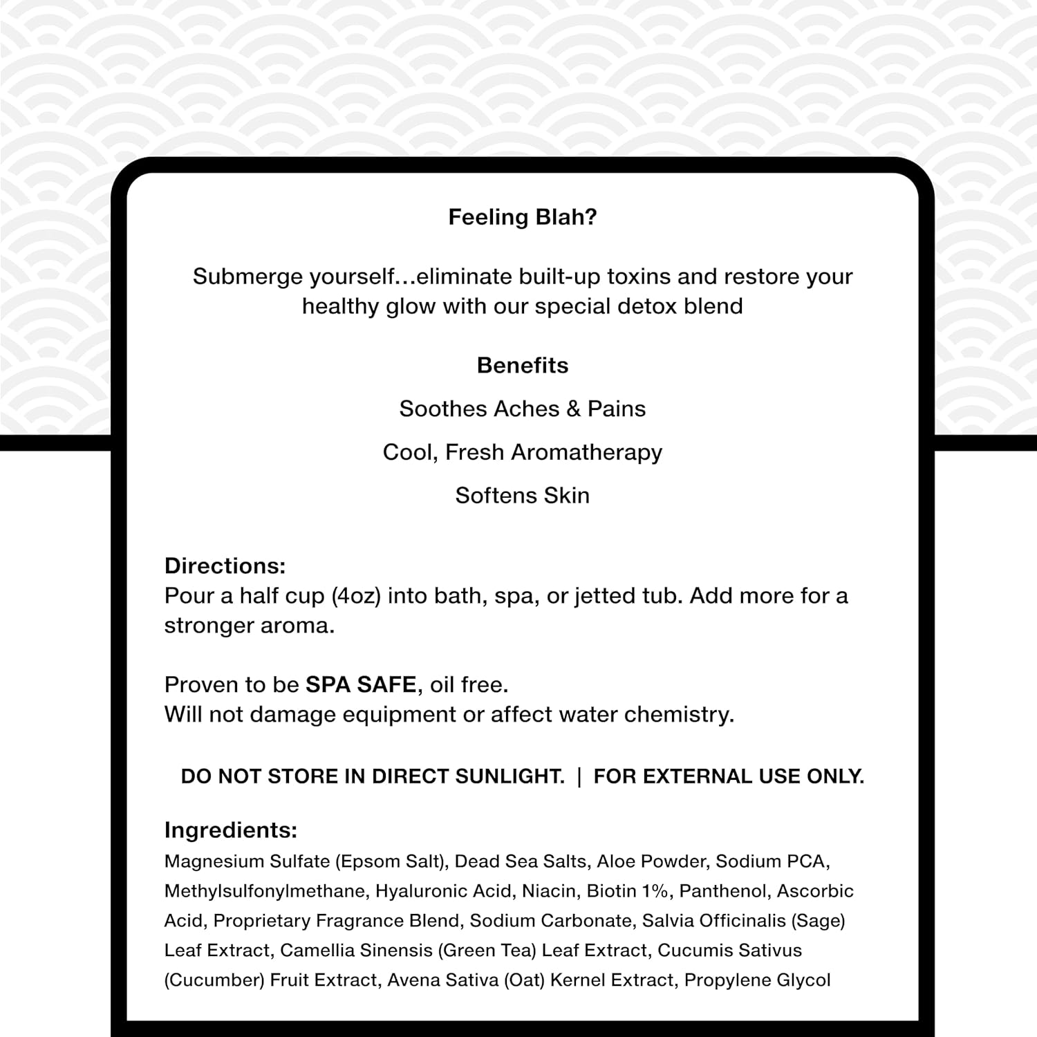 - CLEAN, FRESH SOAK FOR YOUR SPA RITUALS: This mineral-forward blend is designed to help reset your senses with a crisp aromatic profile and a skin-soft finishācrafted specifically for hot tubs and Jacuzzis using premium aromatherapy bath salts.