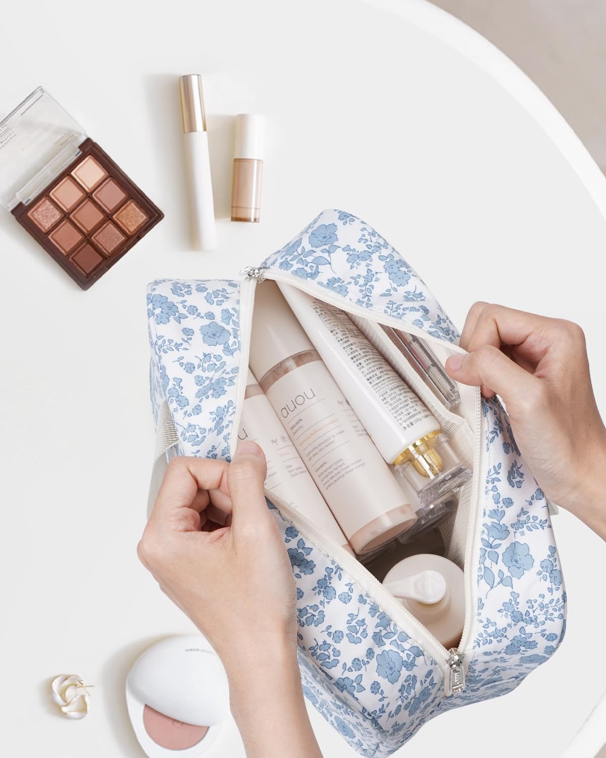 Narwey Full Size Toiletry Bag Women Large Cosmetic Bag Travel Floral Makeup Bag Organizer Medicine Bag for Toiletries Essentials Accessories (Little Blue Flower,Large)