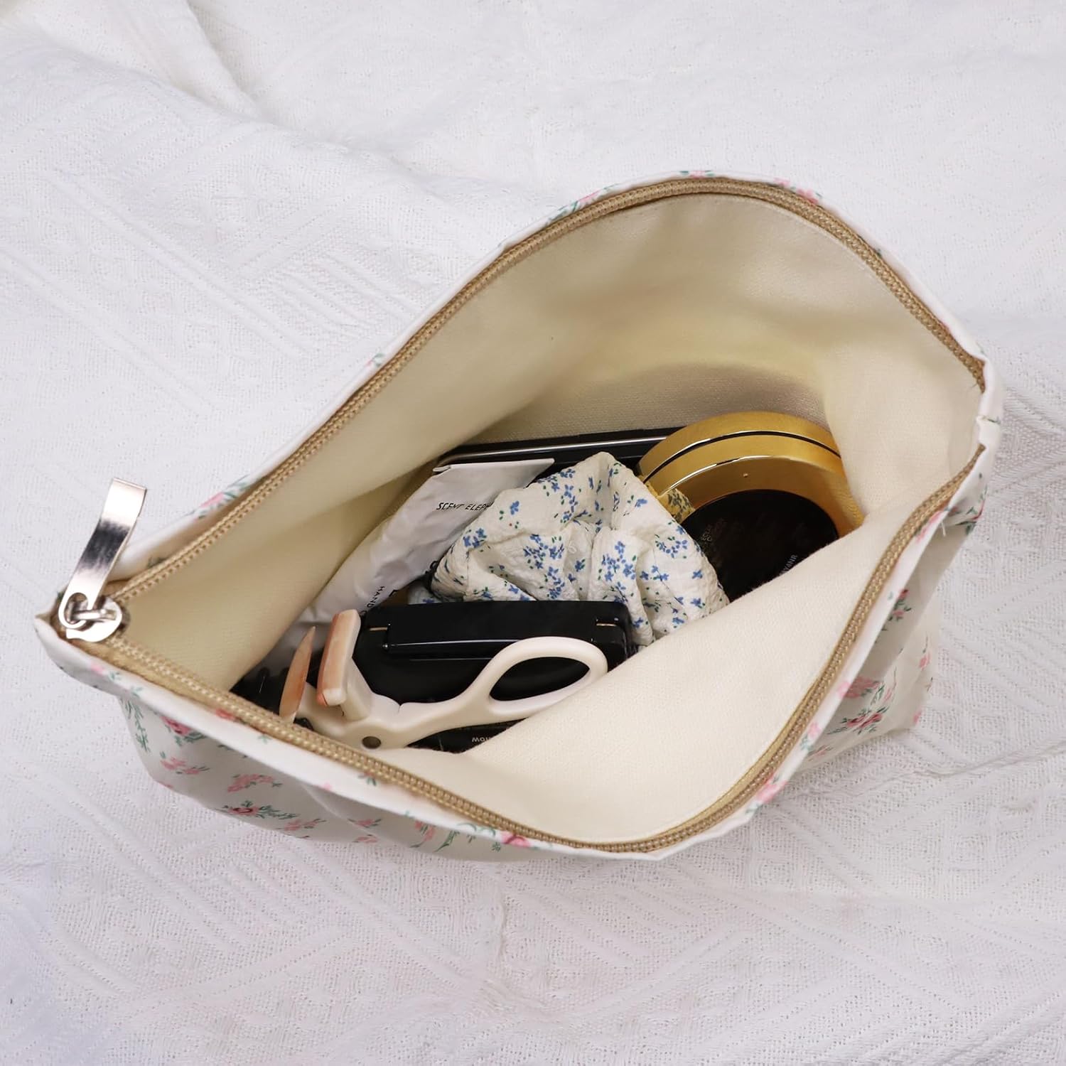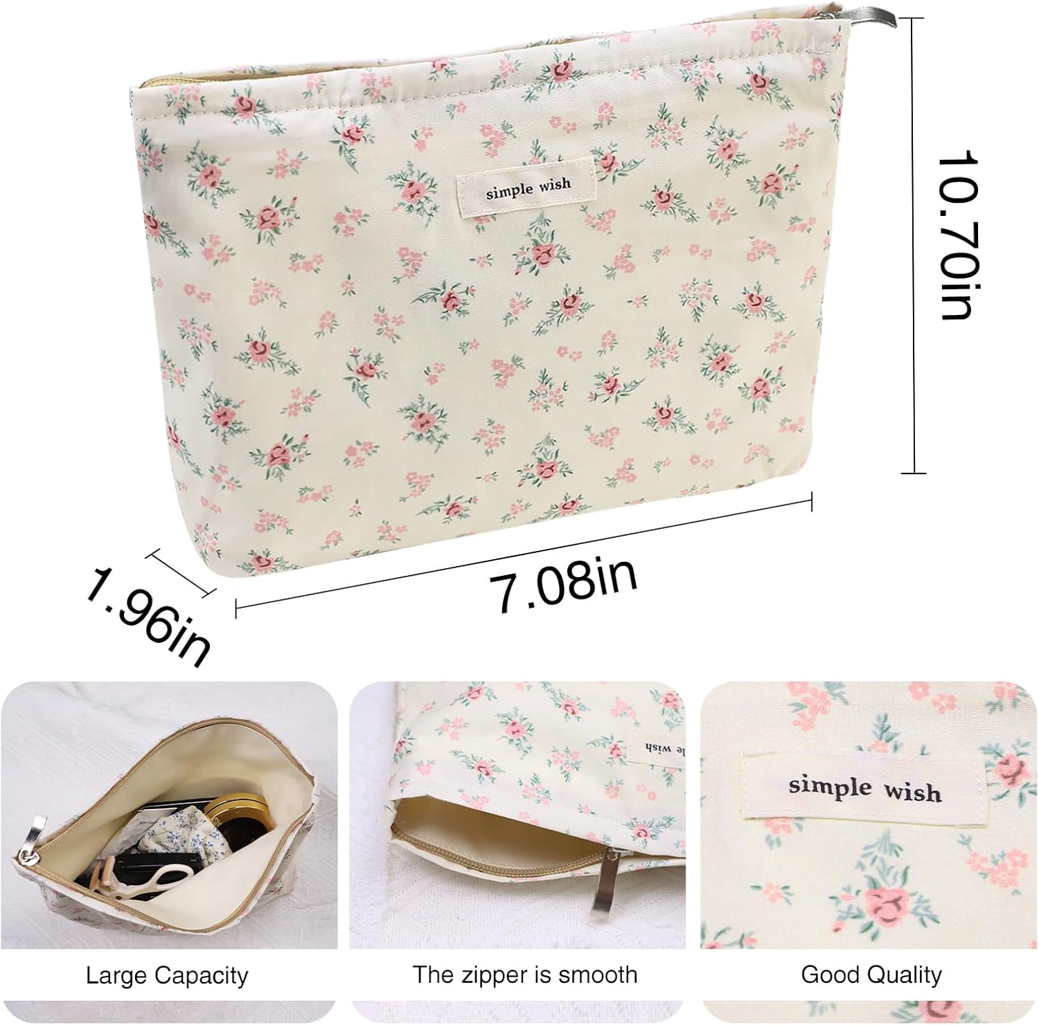 Wudygirl Large Capacity Makeup Pouch Aesthetic Cute Makeup Bag Canvas Toiletry Bag Pencil Pouch with Zipper (Beige and Small Floral)