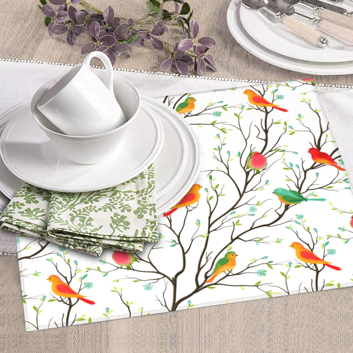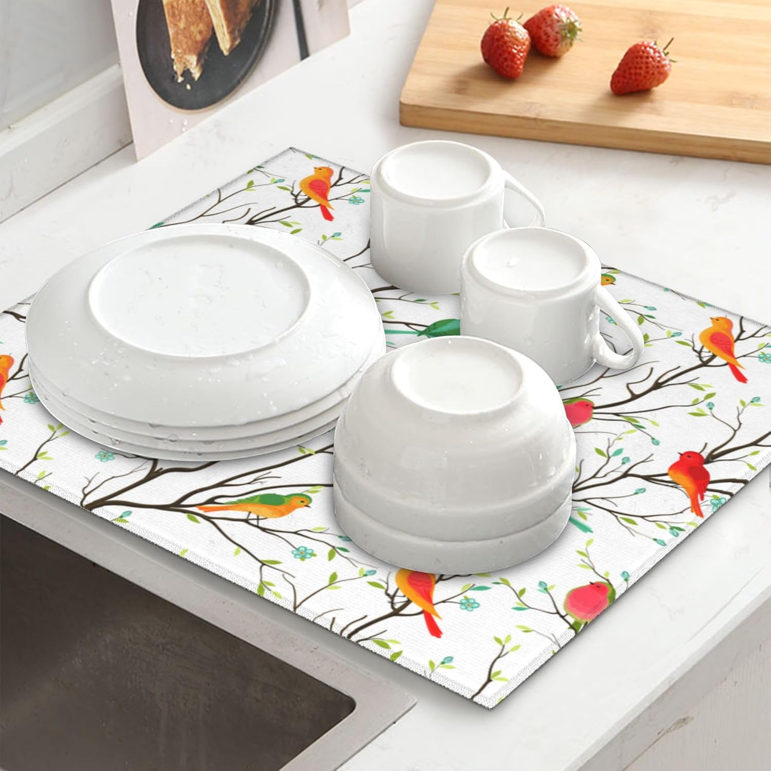 Birds on Tree Dish Drying Mat for Kitchen Counter Washable Absorbent Reversible Microfiber Cute Birds Drying Pad Kitchen Accessories 16x18 Inch