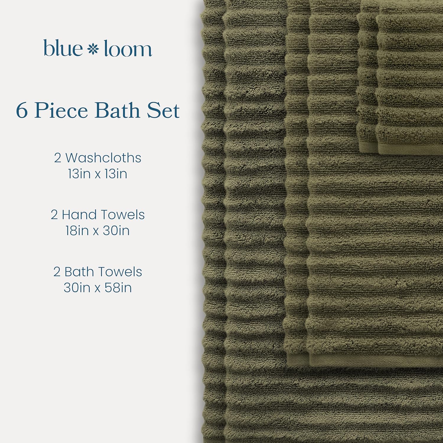 Blue Loom Ribbed Bath Towels Set, 100% Cotton 600GSM, Soft Absorbent Durable 2 Bath Towels, 2 Hand Towels, 2 Wash Cloths for Bathroom - Mason (58" x 30" inch Towels) (Moss, 6 Piece)