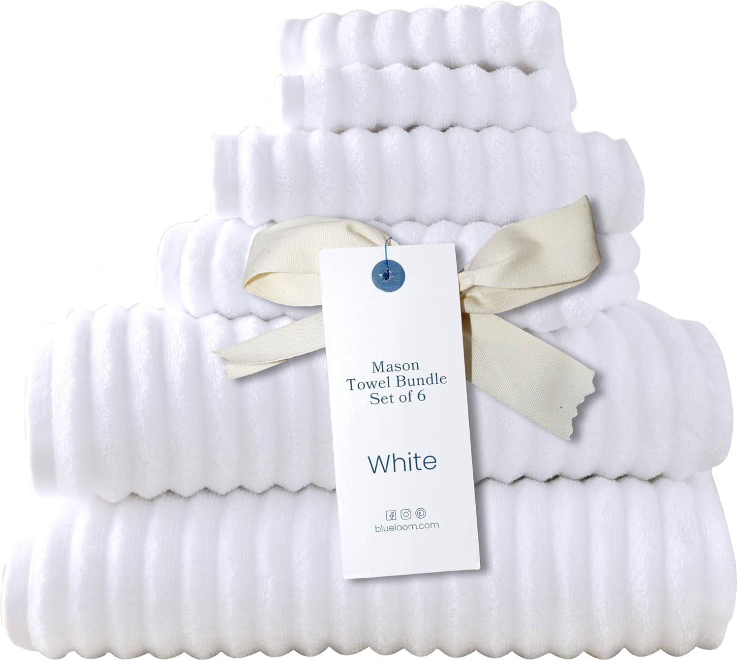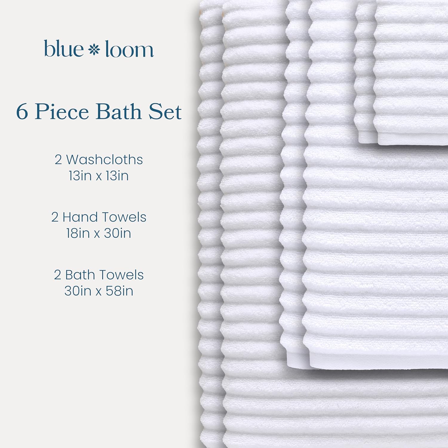 Blue Loom Ribbed Bath Towels Set, 100% Cotton 600GSM, Soft Absorbent Durable 2 Bath Towels, 2 Hand Towels, 2 Wash Cloths for Bathroom - Mason (58" x 30" inch Towels) (White, 6 Piece)