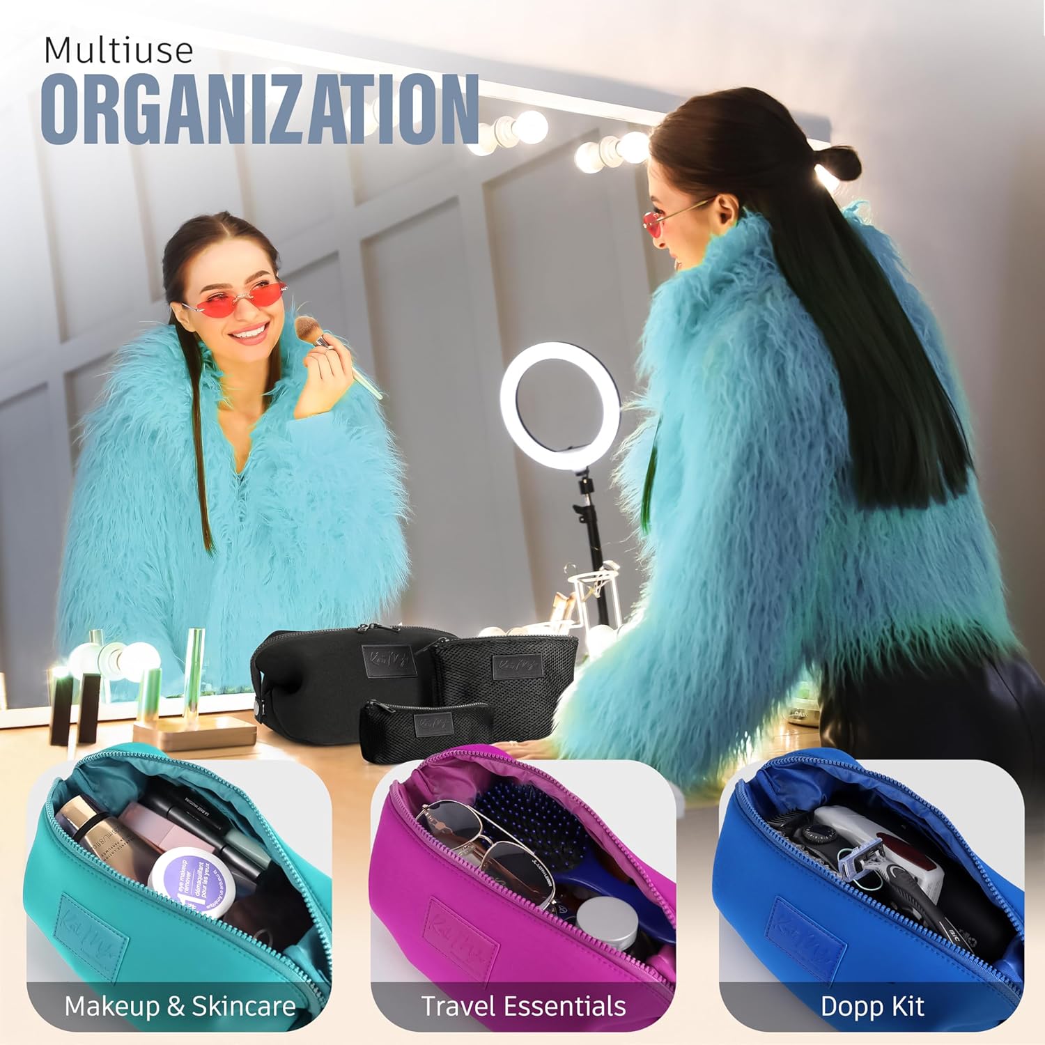 Kat Myhr Neoprene Washable Travel Makeup & Cosmetic Bag Set, 2 Air Mesh Pouches,100% Neoprene Toiletry Bag, Large Water Resistant Travel Bag for Toiletries, Makeup Cosmetic Travel Bag (Jet Black)