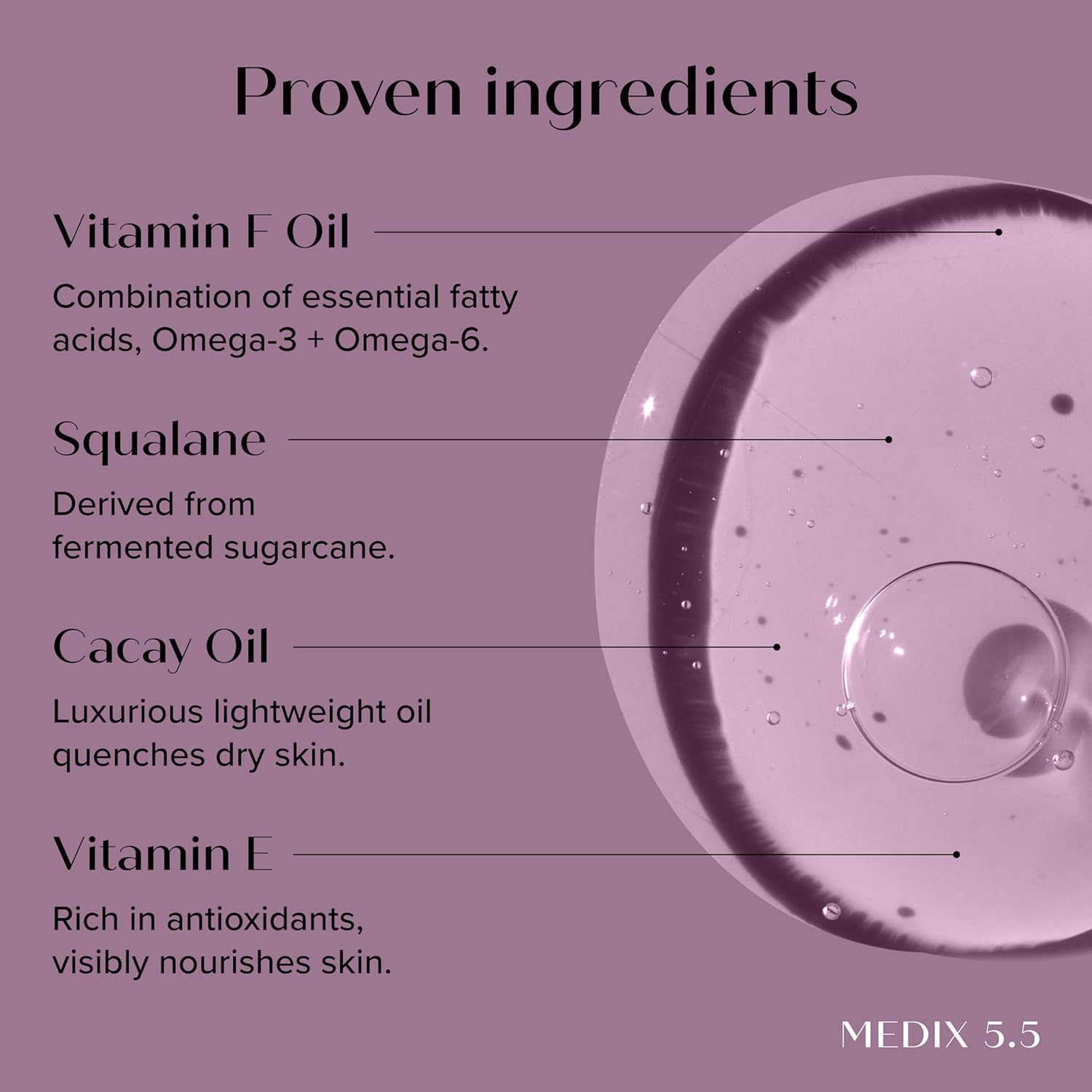 - MOISTURE BOMB – A rich moisture bomb of Vitamin F replenishes tight dry skin, helps protect the skin from environmental stressors that cause premature aging, and supports a healthy skin barrier. Continued use of Vitamin F in your daily skin care routine will help diminish the appearance of wrinkles, redness of skin, flakey dry skin, & fine lines by promoting healthy cell function and regulating excessive water loss.