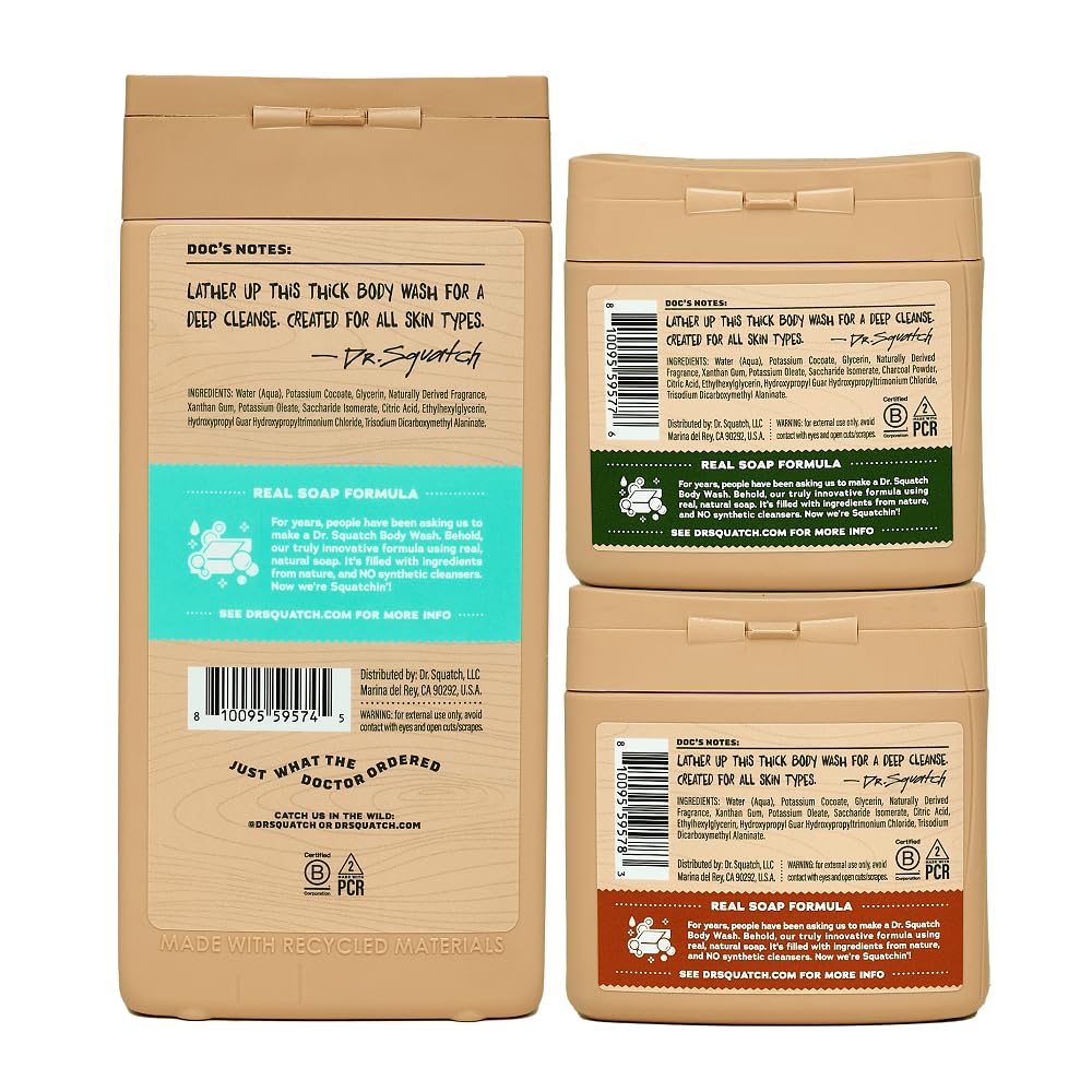 Dr. Squatch NEW Body Wash for Men with Nourishing, Natural Ingredients | No Paraben, Phthalate, Sulfate | Coconut Castaway (14 oz), Wood Barrel Bourbon & Pine Tar (8 oz, 2-Pack) & Body Scrubber