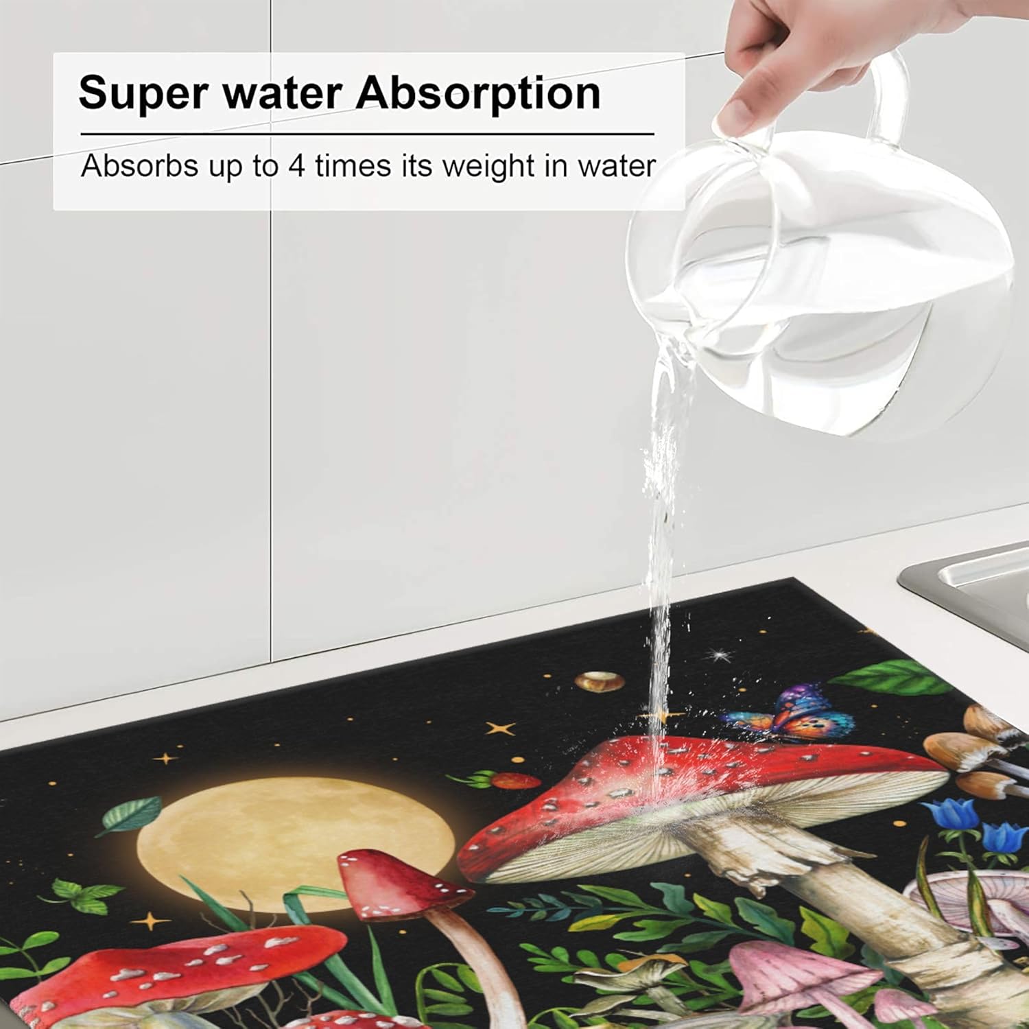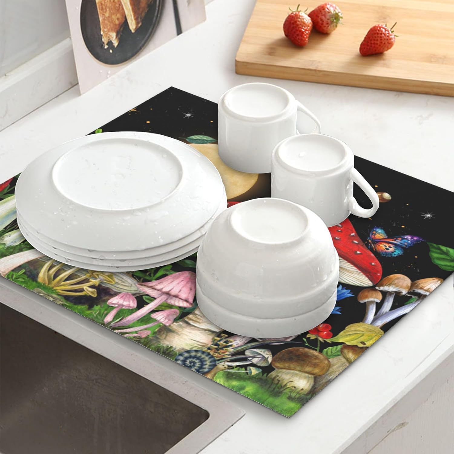 Mushroom Dish Drying Mat for Kitchen Counter Cute Decorative Dish Drainer Rack Mats 16x18 Inch Absorbent Reversible Witchy Drying Pad
