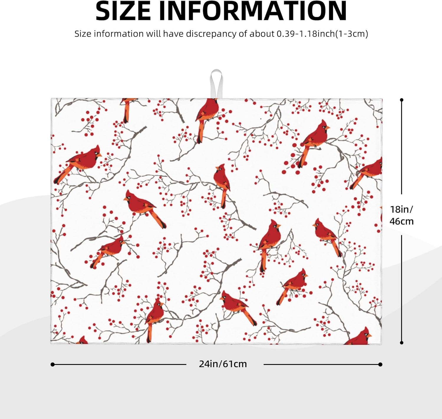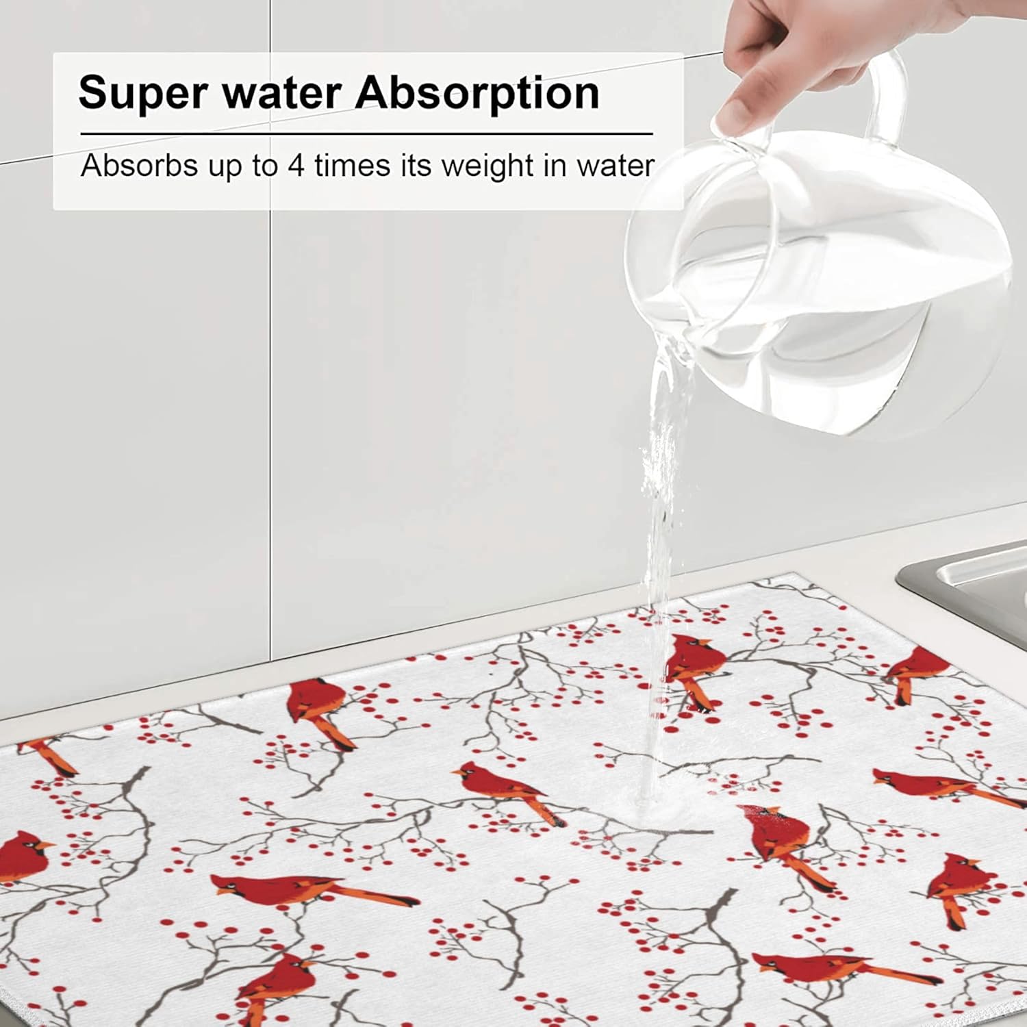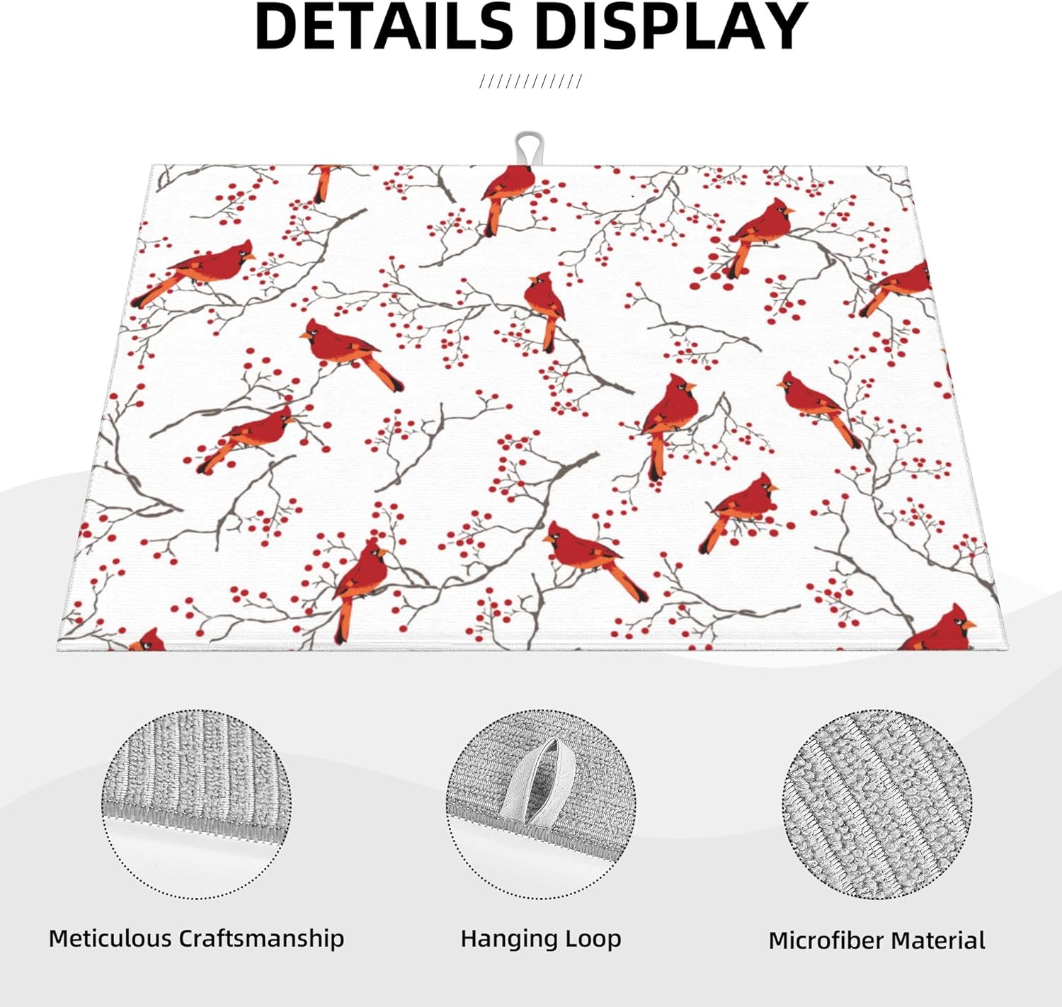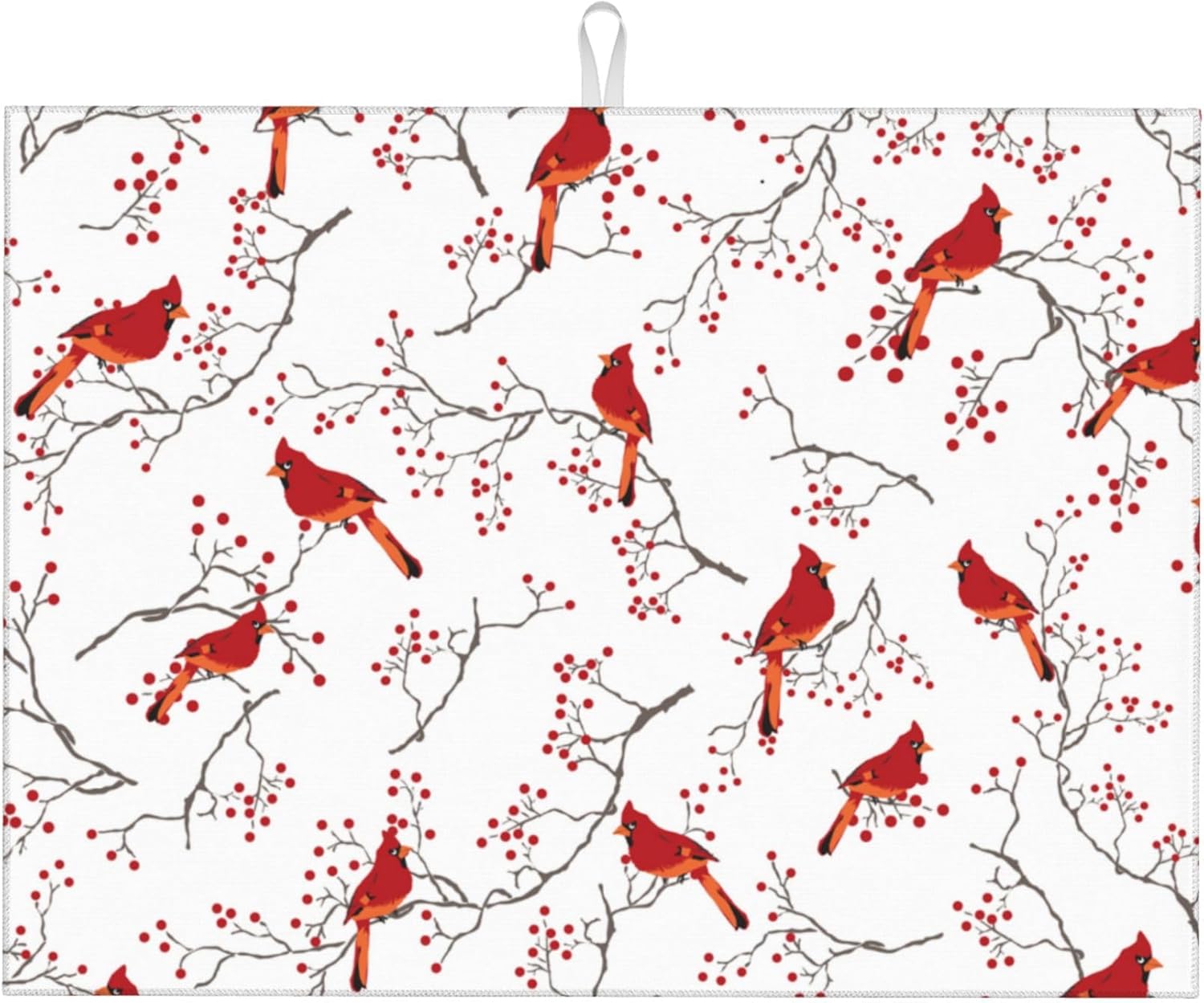 Cardinal Bird Red Berry Decor Microfiber Dish Drying Mat for Kitchen Counter Cute Dishes Pad Dish Drainer Rack Mats 18"x24" Absorbent Washable Reusable Home Holiday Decor