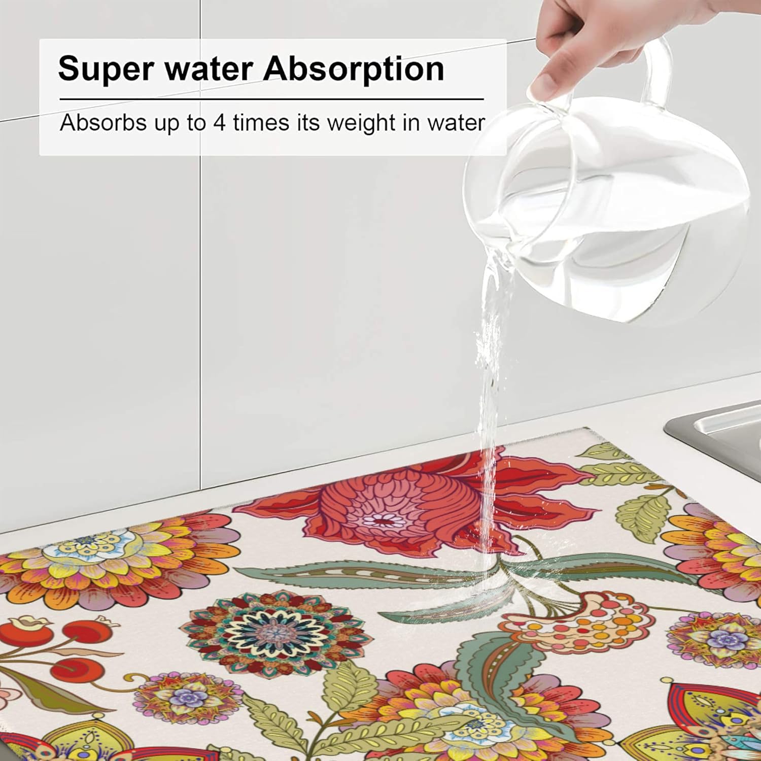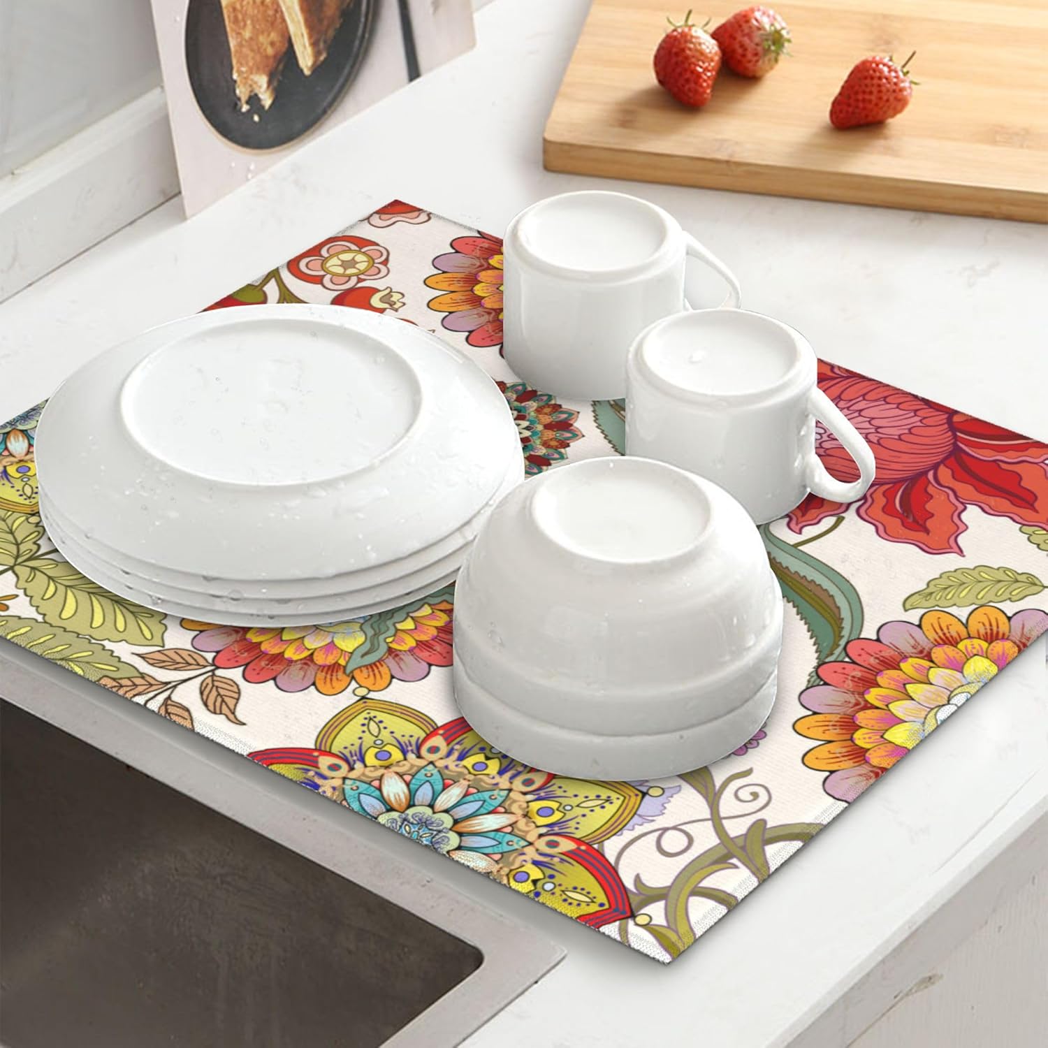 Boho Floral Dish Drying Mat for Kitchen Counter Washable Absorbent Reversible Microfiber Colorful Decorative Drying Pad Kitchen Accessories 16x18 Inch