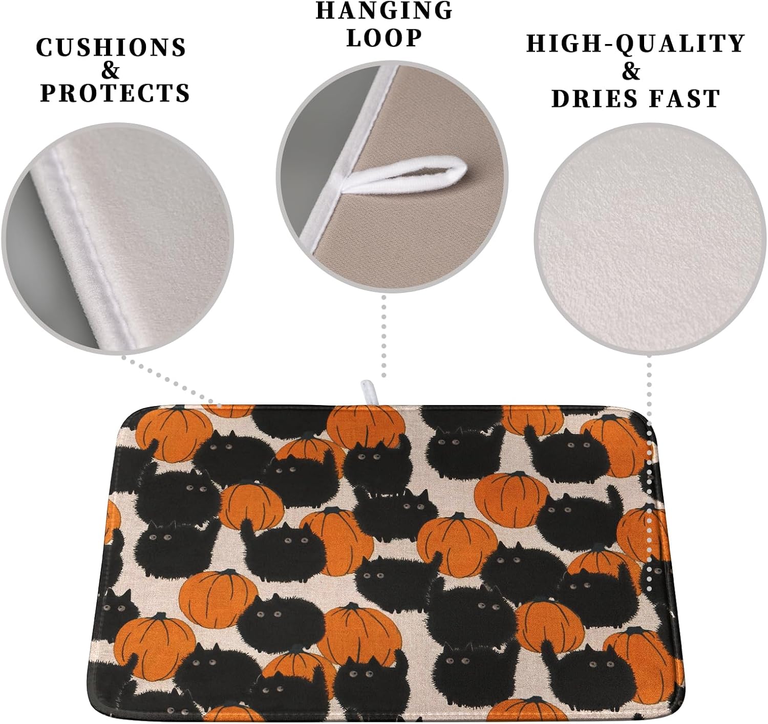 Happy Halloween Dish Drying Mat for Kitchen Counter 16x18 Inch Cute Pumpkin Black Cat Trick or Treat Drying Mats Large Microfiber Absorbent Dish Rack Pad for Coffee Bar Sinks Home Accessories