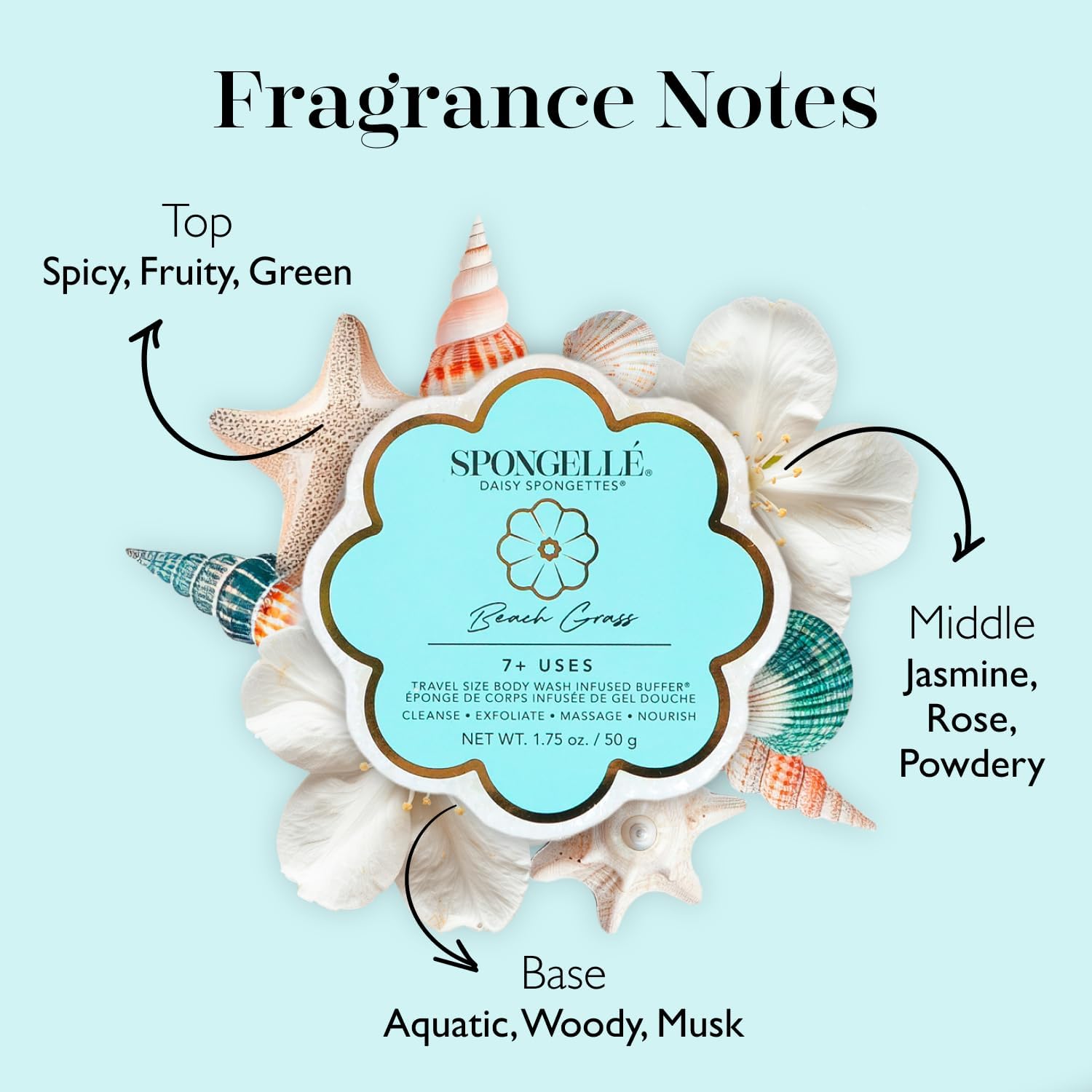Spongelle Beach Grass Spongette Loofah Body Scrubber | Bath & Shower Loofah for Women | Body Scrubber Exfoliator with Body Wash Infused Sponge | 5+ uses | Crisp Marine, Green Tea & White Amber