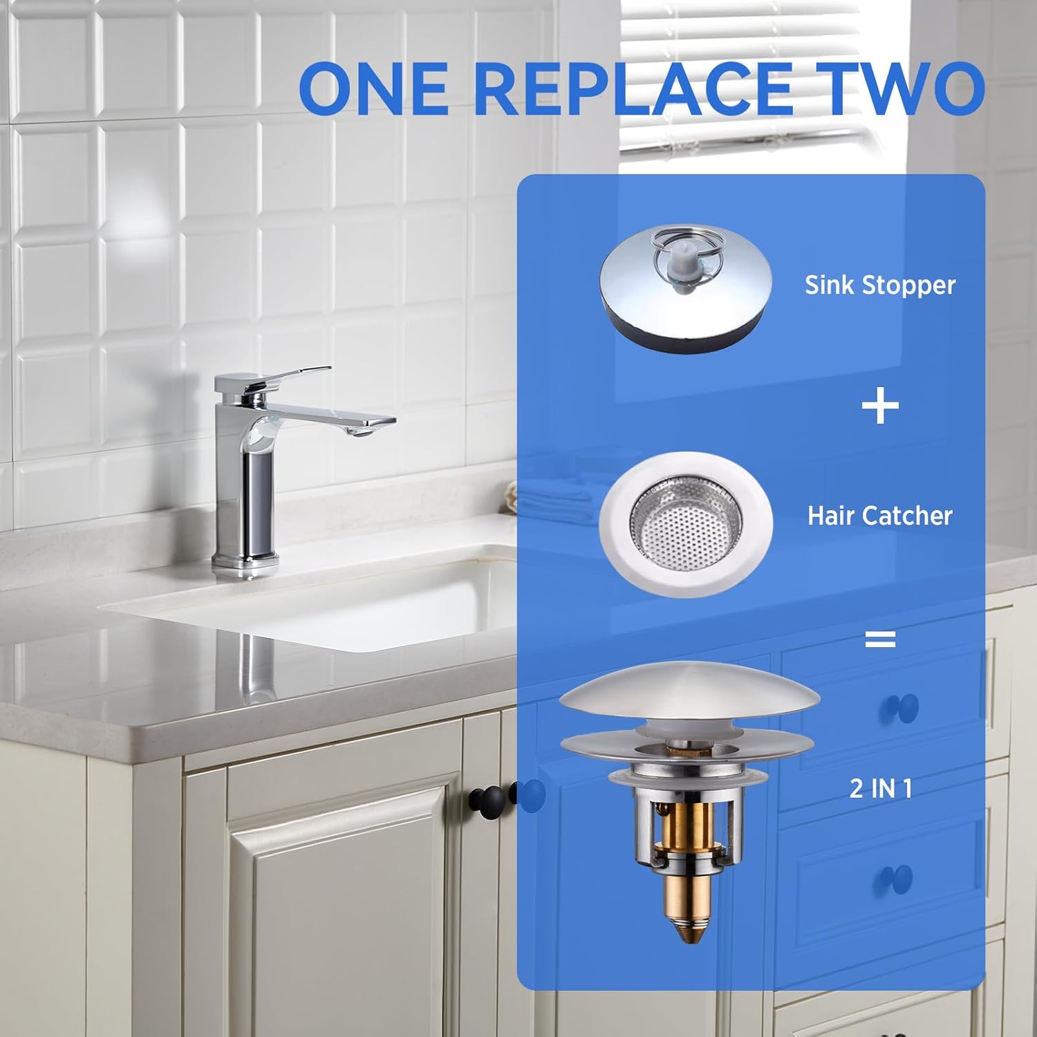 - 【2-in-1 Bathroom Sink Stopper】This dual-function stopper features a built-in spring mechanism that allows you to easily switch between sealing and draining with a simple push. The sink stopper not only stops water flow but also catches hair and small items to prevent clogs, offering more convenience than traditional rubber stoppers.