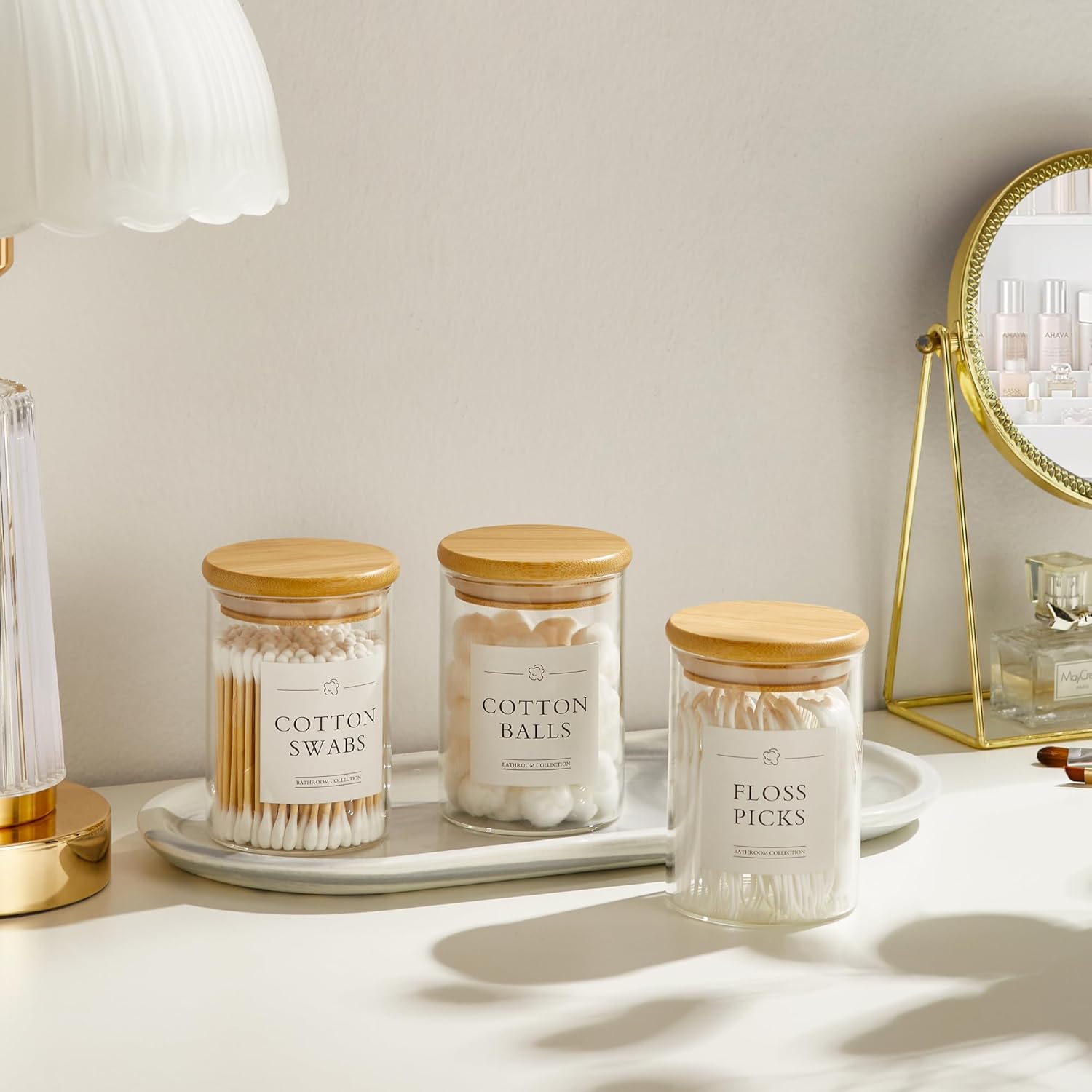- Qtip Holder Bathroom Set: The q tip holder set includes 3 pack glass bathroom containers jars; 6 labels with black pre-printed words (Cotton Swabs, Cotton Balls, Cotton Pads, Floss Picks, Hair Ties, Bath Salts); and 3 blank labels.