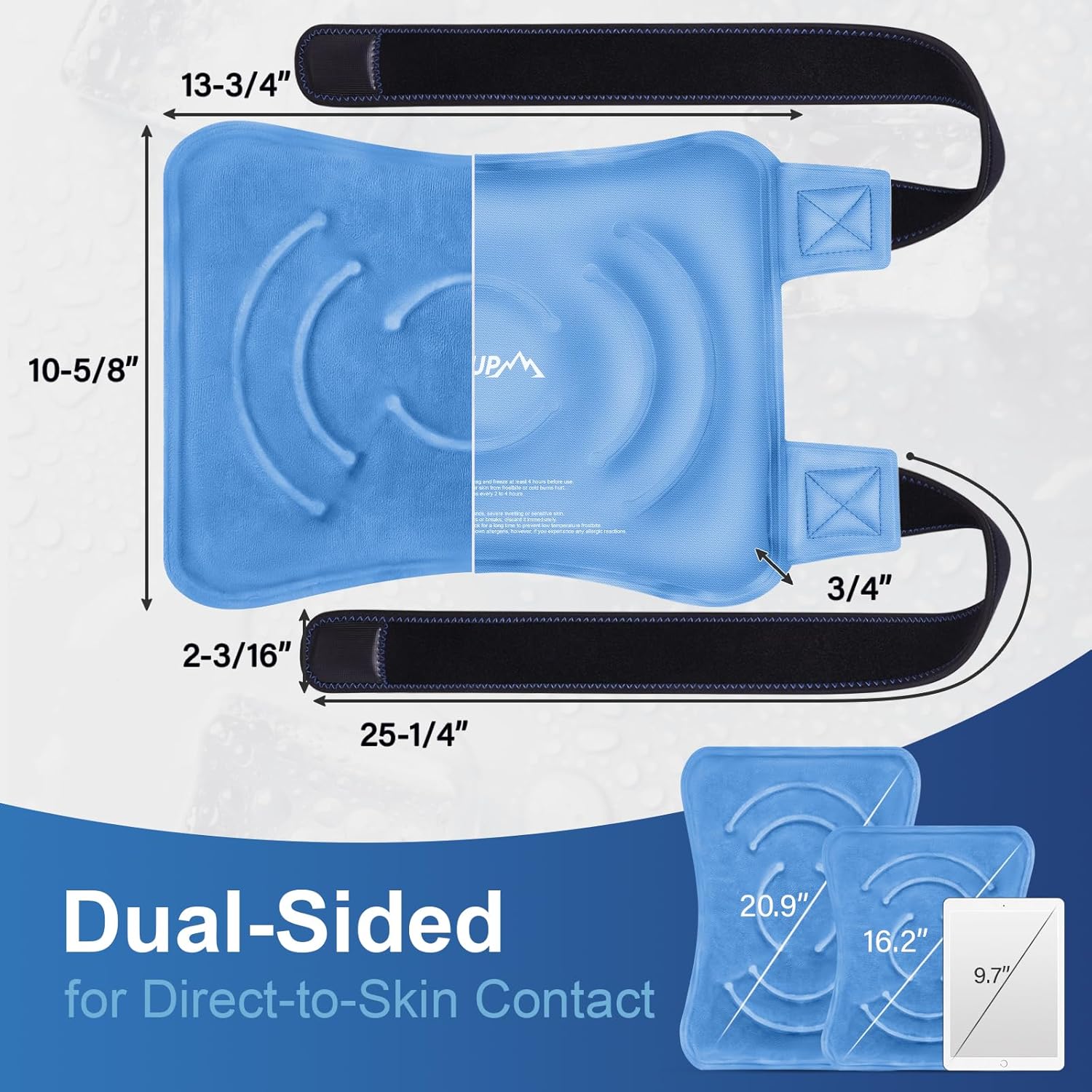 - [COMFORT FIT] Measures 13.8" x 10.6" and weighs 1.54lb, filled with more gel, the knee ice pack wrap has soft plush lining for comfortability and two 25" lengths of elastic straps to ensure that stays securely in place and free your hands. It can be used on various body parts including the knee, shoulder, back, elbow, leg, and ankle. (PLEASE NOTE that the straps are not long enough to wrap around the entire waist)