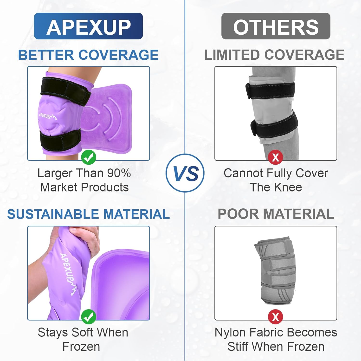 - [REUSABLE & LONG LASTING] The APEXUP gel ice pack for knee features a silky nylon fabric outer layer for enhanced durability and improved cold penetration. It is filled with professional-grade gel that remains soft and pliable even after freezing, providing up to 30 minutes of cold therapy for effective pain relief.