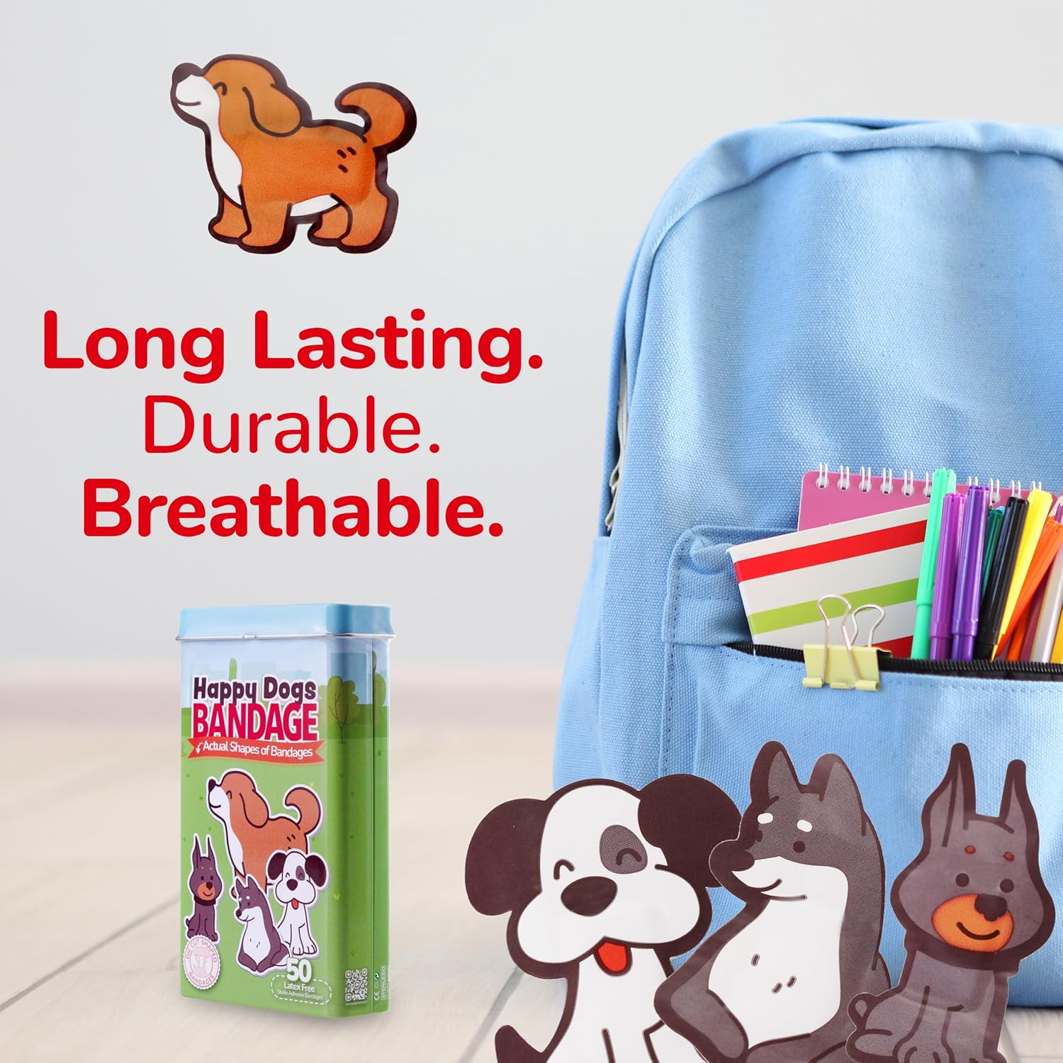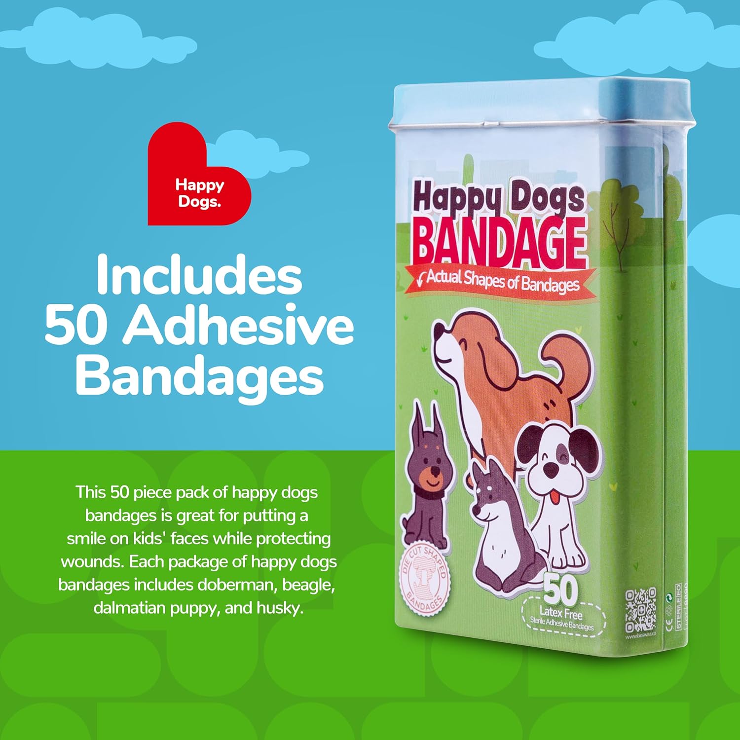 - 50 HAPPY DOG KIDS BANDAGES: Fun dog-shaped adhesive bandages tin helps protect cuts, scrapes, and minor wounds while making healing less stressful for children; bandages come in 4 assorted styles