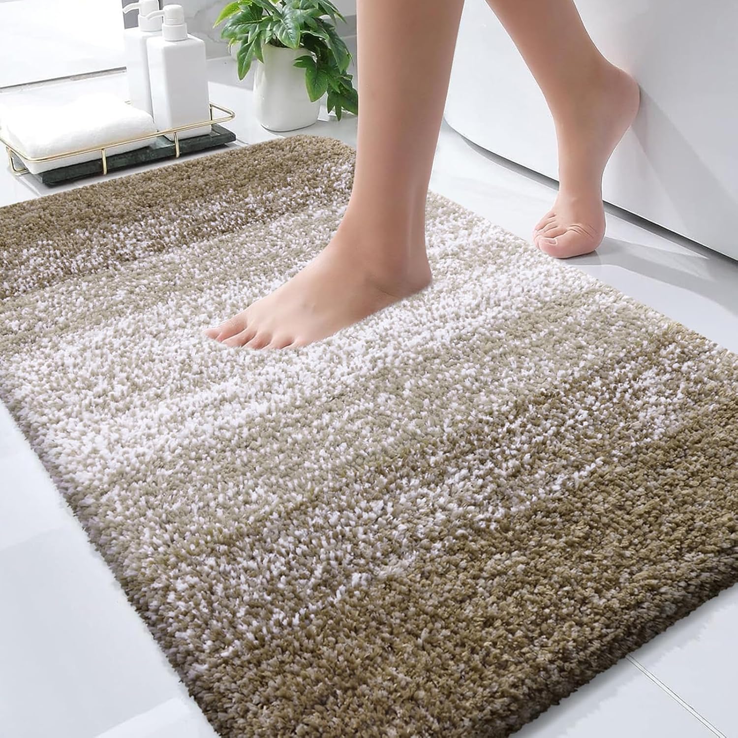 - [Luxuriate in Pure Comfort] Indulge your feet in the softest, coziest microfiber imaginable. With its plush pile, nearly one inch thick, our bath mat soothes and warms your feet, protecting them from the cold floor below. Enhance your bathroom decor with OLANLY's captivating bath mat. The gradient color stripe design seamlessly merges stripes, creating an eye-catching pattern that infuses sophistication into your space.