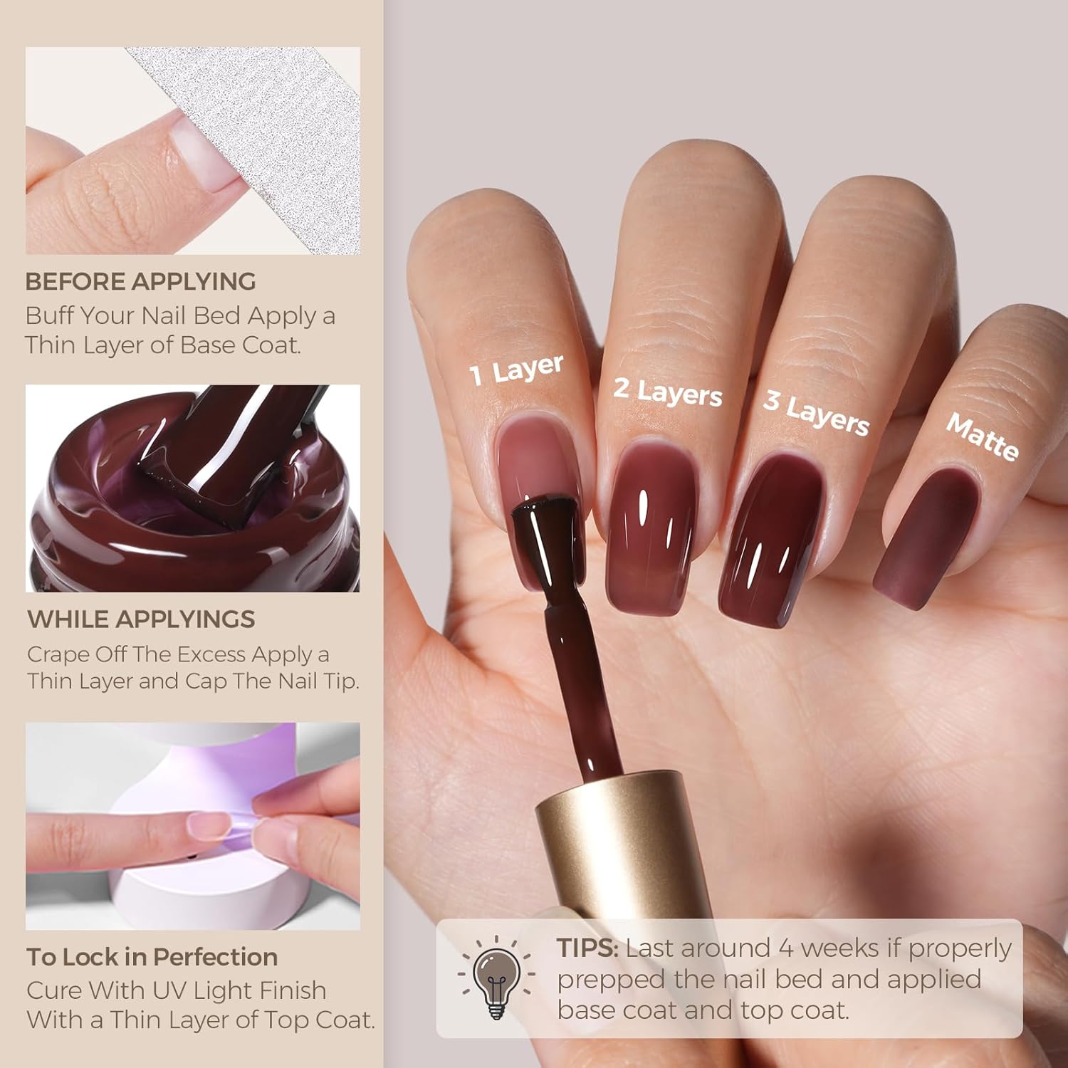 - Jelly Feeling Nude Gel Nail Polish: AILLSA brown gel polish has a semi-transparent color, you can adjust the depth of the color according to your preference, the more layers you apply the deeper the color becomes and goes from sheer to opaque. *The color of the gel nail polish will also vary slightly depending on the of the nail bed color.