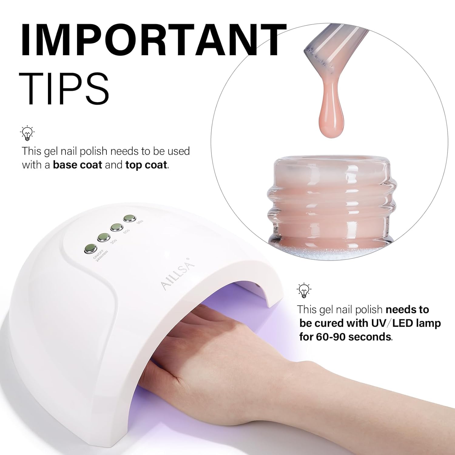 - Jelly Feeling Nude Gel Nail Polish: AILLSA nude gel polish has a semi-transparent color, you can adjust the depth of the color according to your preference, the more layers you apply the deeper the color becomes and goes from sheer to opaque. *The color of the gel nail polish will also vary slightly depending on the of the nail bed color.