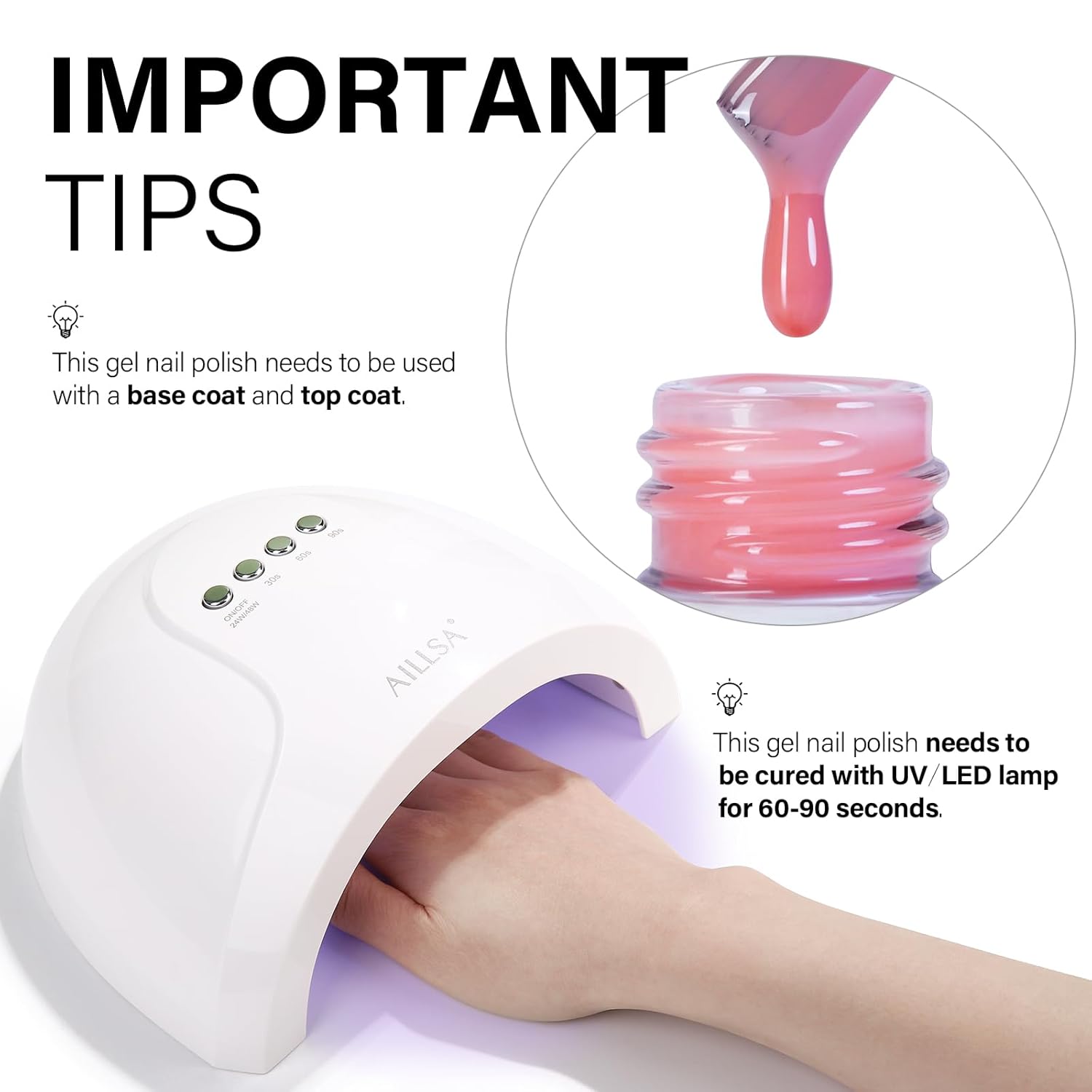 - Jelly Feeling Nude Gel Nail Polish: AILLSA pink gel polish has a semi-transparent color, you can adjust the depth of the color according to your preference, the more layers you apply the deeper the color becomes and goes from sheer to opaque. *The color of the gel nail polish will also vary slightly depending on the of the nail bed color.