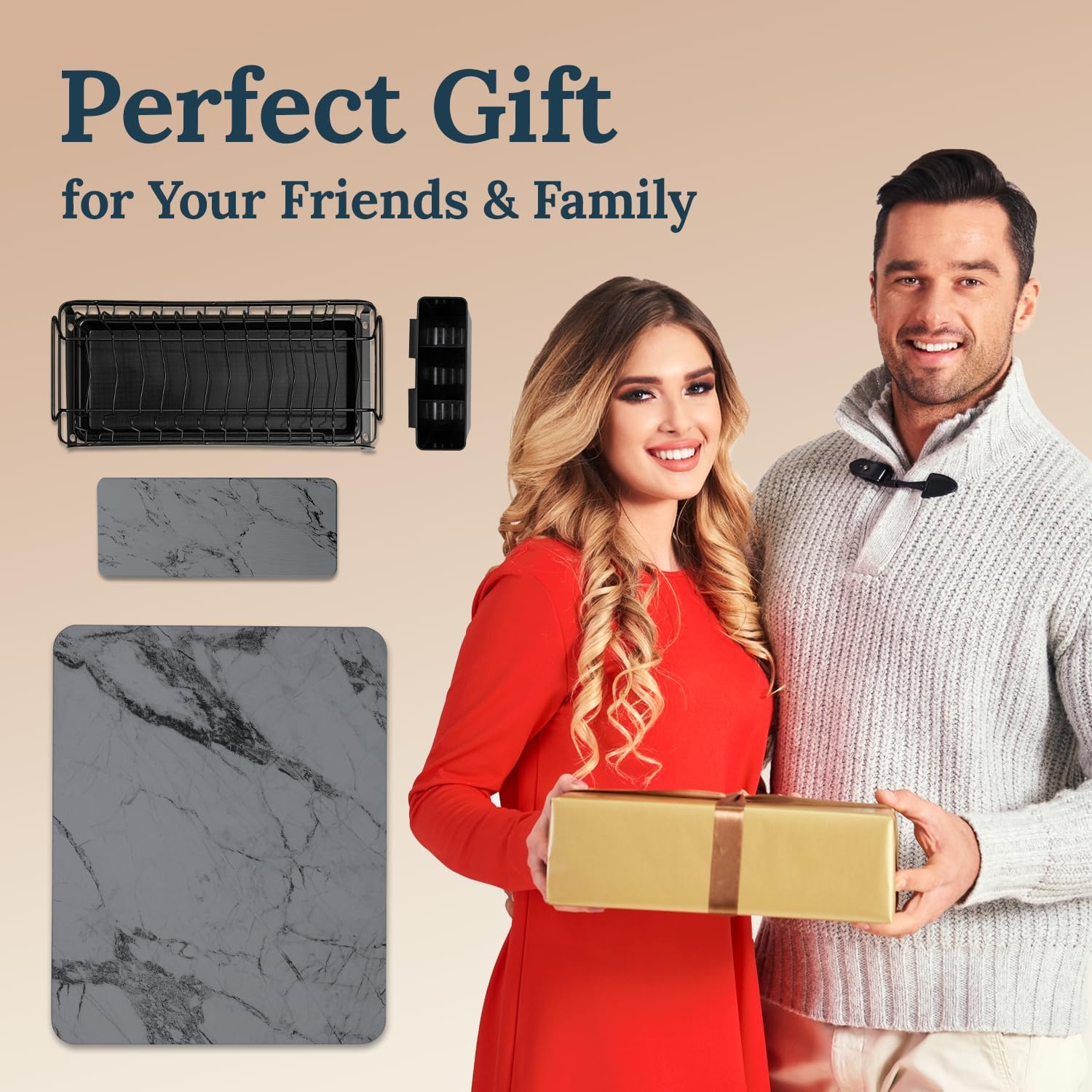 AquaTerra Diatomaceous Earth Drying Mat with Matching Sponge Caddy & Dish Rack | 3-Piece Set (Dark Gray Marble, Large) | Heat-Resistant & Multi-Purpose for Drying and Kitchen Organization