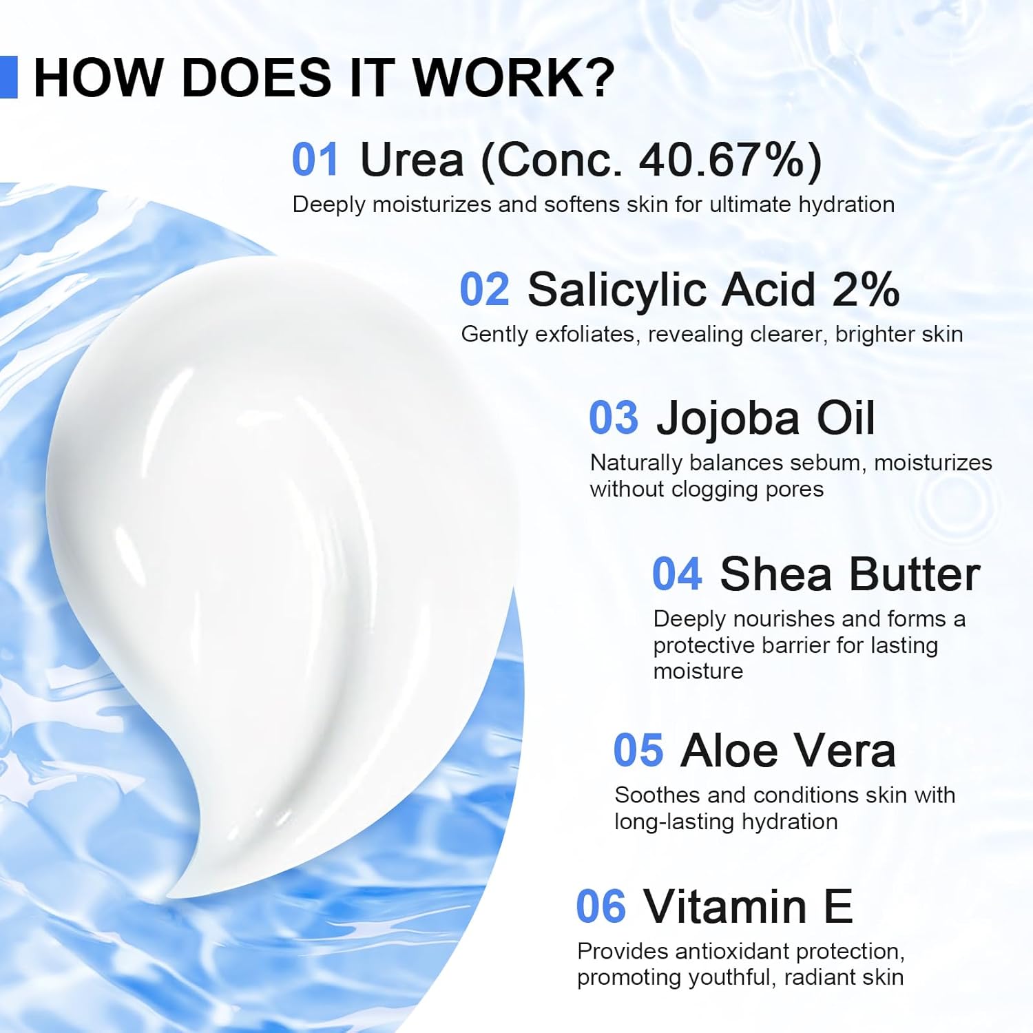 - 【Natural Formula】 TEAWOO Ultra-Hydrating Foot Cream designs for addressing foot issues. This foot cream combines various potent natural moisturizing ingredients, such as urea(conc. 40.67%), salicylic acid, jojoba oil, shea butter, aloe vera, Vitamin E, mineral oil, and glycerin. These components work synergistically to deeply nourish, moisturize and soften dry, rough skin.