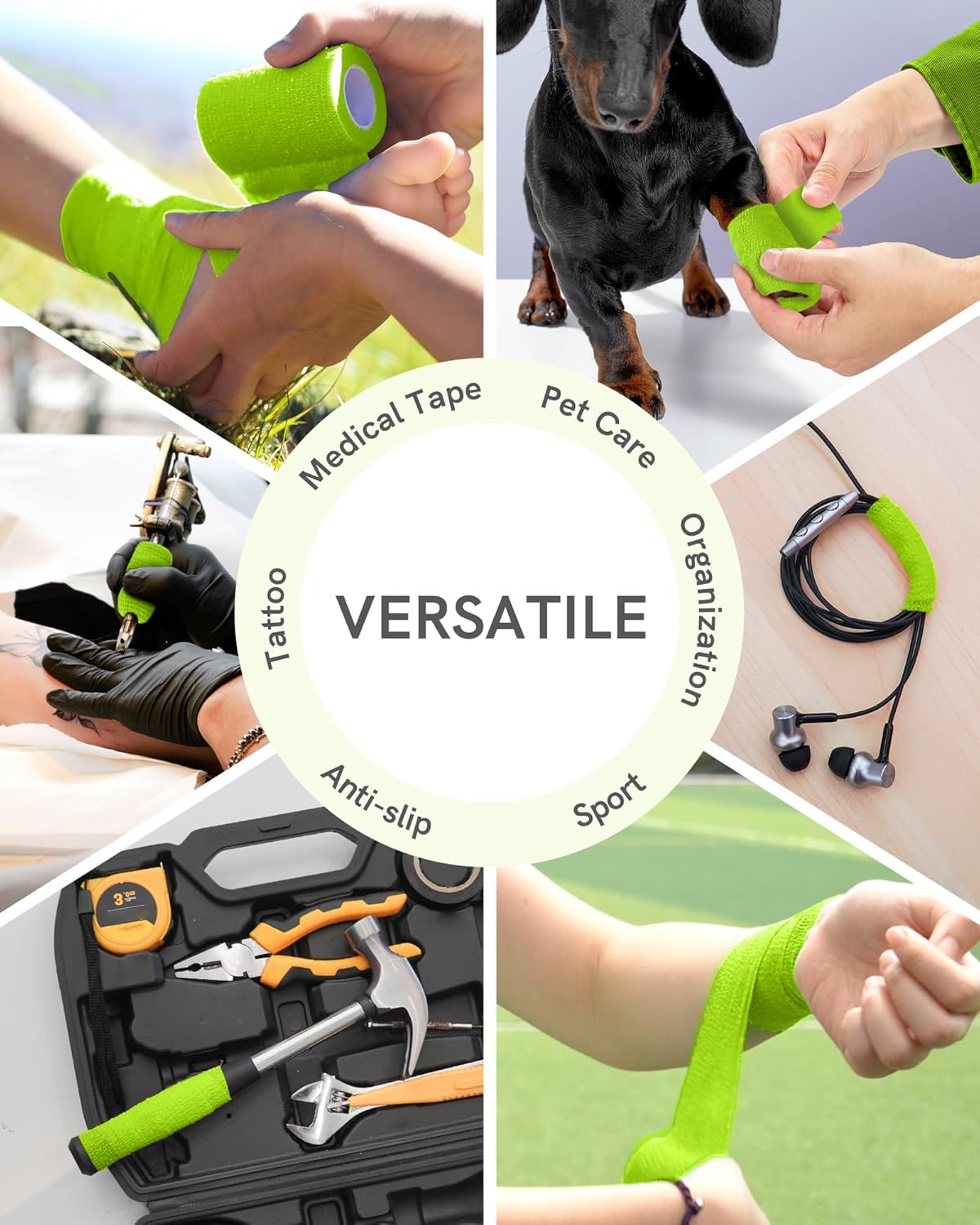FriCARE Self Adhesive Bandage Wrap, Medical Tape in First Aid Kit, Cohesive Bandages for Wounds Sport Vet, 2 Inches X 5 Yards 6 Rolls, Grass Green