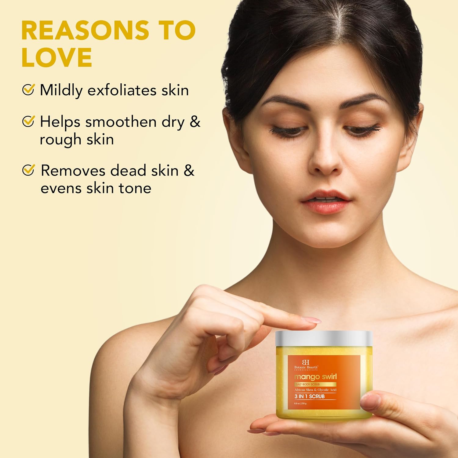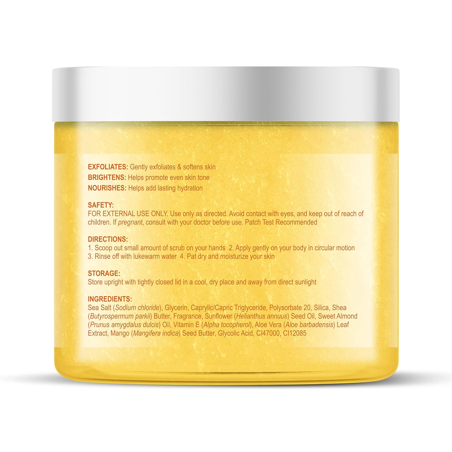- Exfoliates & Refines Skin: The combination of Himalayan Salt and Glycolic Acid in Mango Swirl exfoliating body scrub gently exfoliates, removing dead skin cells and impurities. This process reveals smooth, polished skin