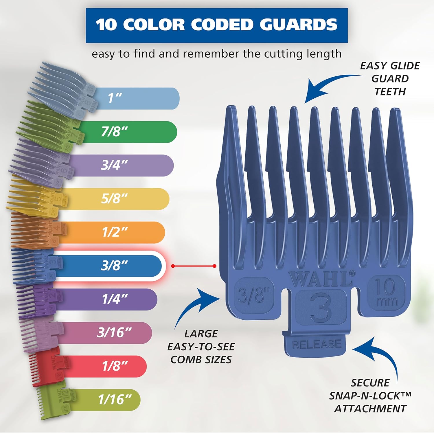 - Easy Match Color Code â 10 Color coded haircutting attachment guards and clipper color key make it easy to find and remember cutting lengths. Corresponding the correct colored comb to the right cutting length (1/16ââ 1â) is simple with our easy-to-use clipper key.