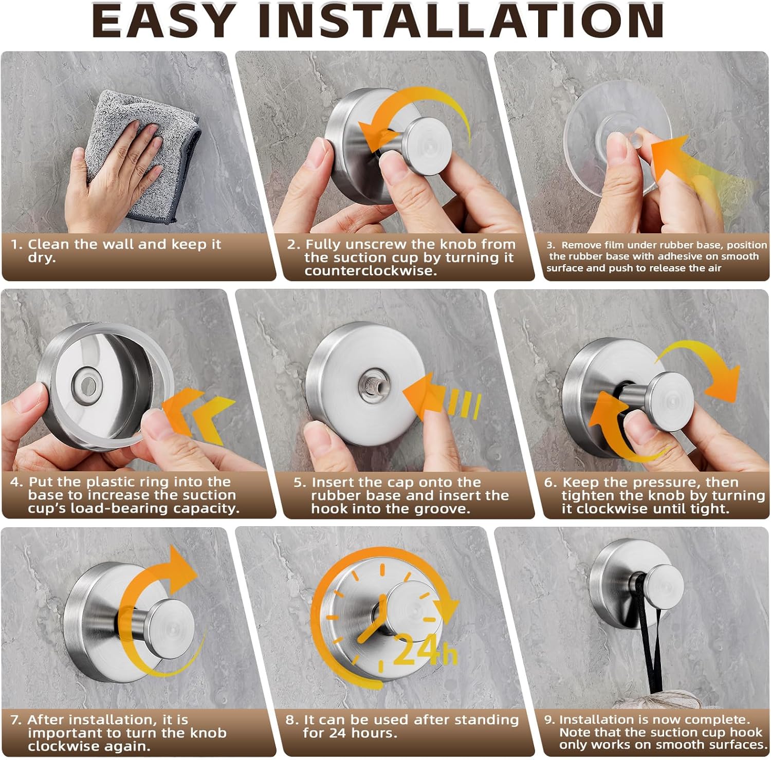 - Wall-Mounted Towel Hooks for Bathroom/ Easy-Install Shower Hooks: Say goodbye to drilling holes! Our towel hooks for bathroom wall mounted utilize advanced vacuum suction technology to attach securely to glass, stainless steel, or polished tiles. Built-in self-adhesive base forms an air-tight vacuum seal on glass, tile, stainless steel and other smooth Non-Porous surfaces â works even in wet bathrooms! Align hook vertically Then press firmly to expel air and lock it.these bathroom suction hooks support umbrellas, coats, flower wreaths, and kitchen supplies - perfect for renters who value reusable and removable storage solutions!