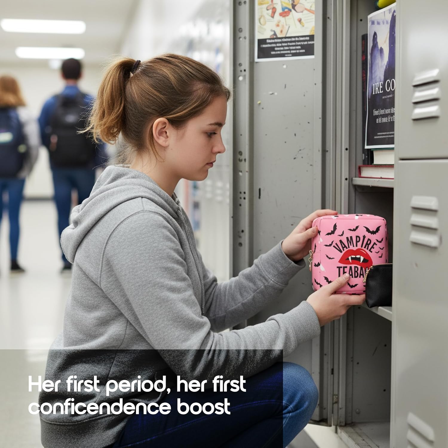 - DISCREET & COMPACT – Slim 5"x5" period bags for teen girls for school, keeps pads, tampons, and wipes hidden yet accessible. Fits easily in backpacks, purses, or lockers, giving teens and women privacy, confidence, and convenience at school, work, or on the go. Designed to sit flat on counters or locker shelves without slipping.