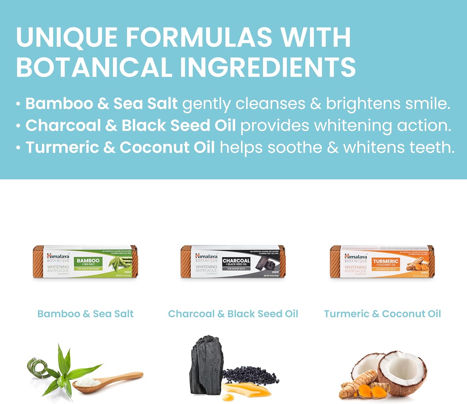 - 3 flavors of Himalaya toothpaste favorites: Comes with 2 tubes of Turmeric + Coconut Oil, 1 tube of Bamboo + Sea Salt, and 1 tube of Charcoal + Black Seed Oil for antiplaque and whitening teeth
