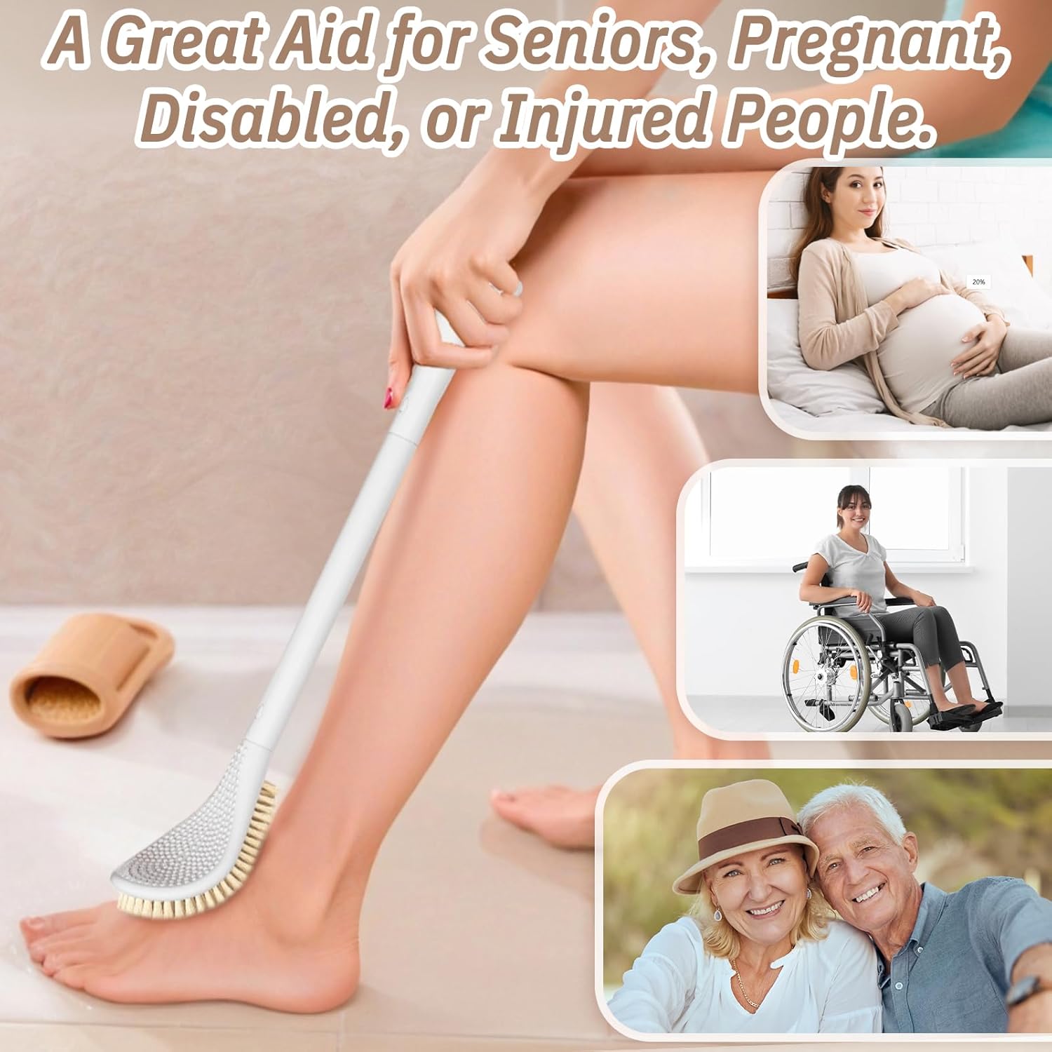 - 【Adjustable 3-in-1 Handle & Ergonomic Brush Head】Foot scrubber handle can be adjusted to three different lengths to meet different needs. Shortest one is perfect for hand-hold brushing, medium one for scrubbing legs and popliteal fossa areas, longest one for brushing feet and toes without bending. Curved angle of the brush head suits your feet and legs’ curved shape perfectly. It will go deep down to clean those areas much better than flat brushes.
