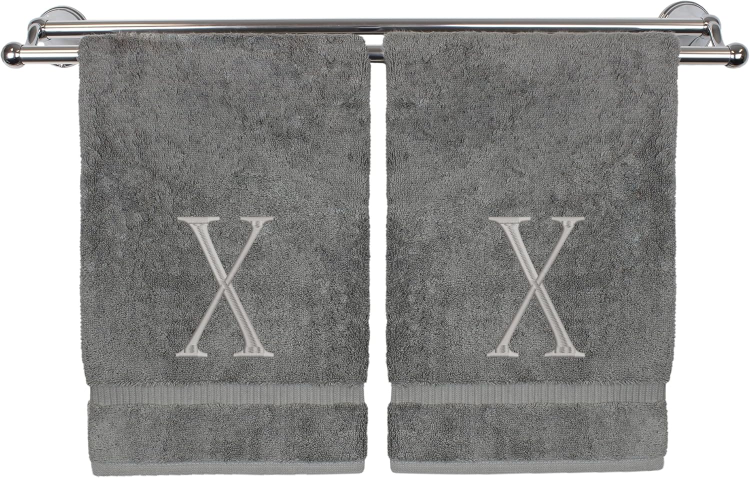 Monogrammed Hand Towel, Personalized Initial Gift, Extra Absorbent 100% Turkish Cotton - Soft Terry Finish - Set of 2 - Silver Block Initial X - Embroidered on Grey Towels